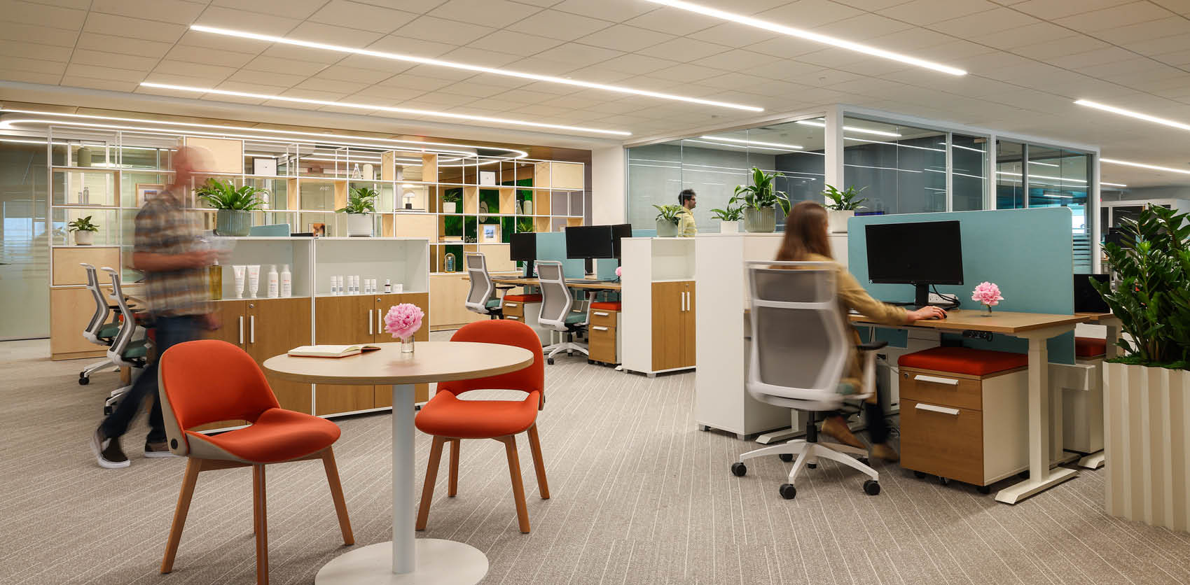 The open workplace configuration promotes collaboration, by seamlessly blending organic forms with biophilic elements that connect people to nature. The open layout integrates a variety of functional spaces – from open offices and huddle rooms to a large communal pantry, all which are elevated by architectural highlights such as biophilic green walls, transitional glass, and large-format fabric pendant lighting.
