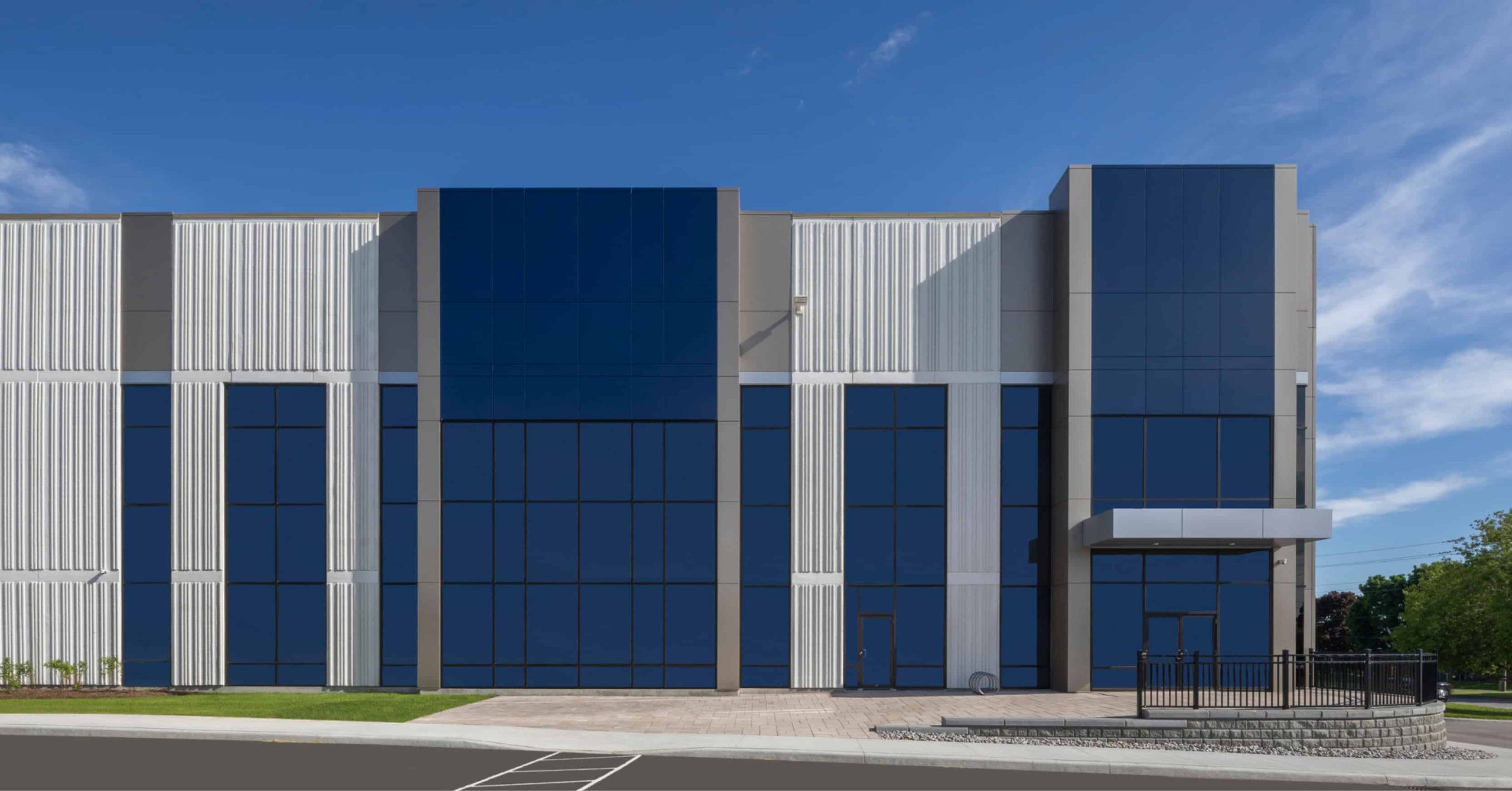 The development’s modern exterior design features a blend of white precast ribbed panels that includes curtain walls and ACM panels at the main entrances and midpoint of the building. The main entrances have a controlled blend of massing between the ACM panels and curtain walls. The building exterior features bronze, deep blue and silver ACM paired with bronze spandrel panels and bronze vision glass. The land between the two buildings was maximized with the creation of a functional shared courtyard for loading docks and trailer parking that is screened from the main road.