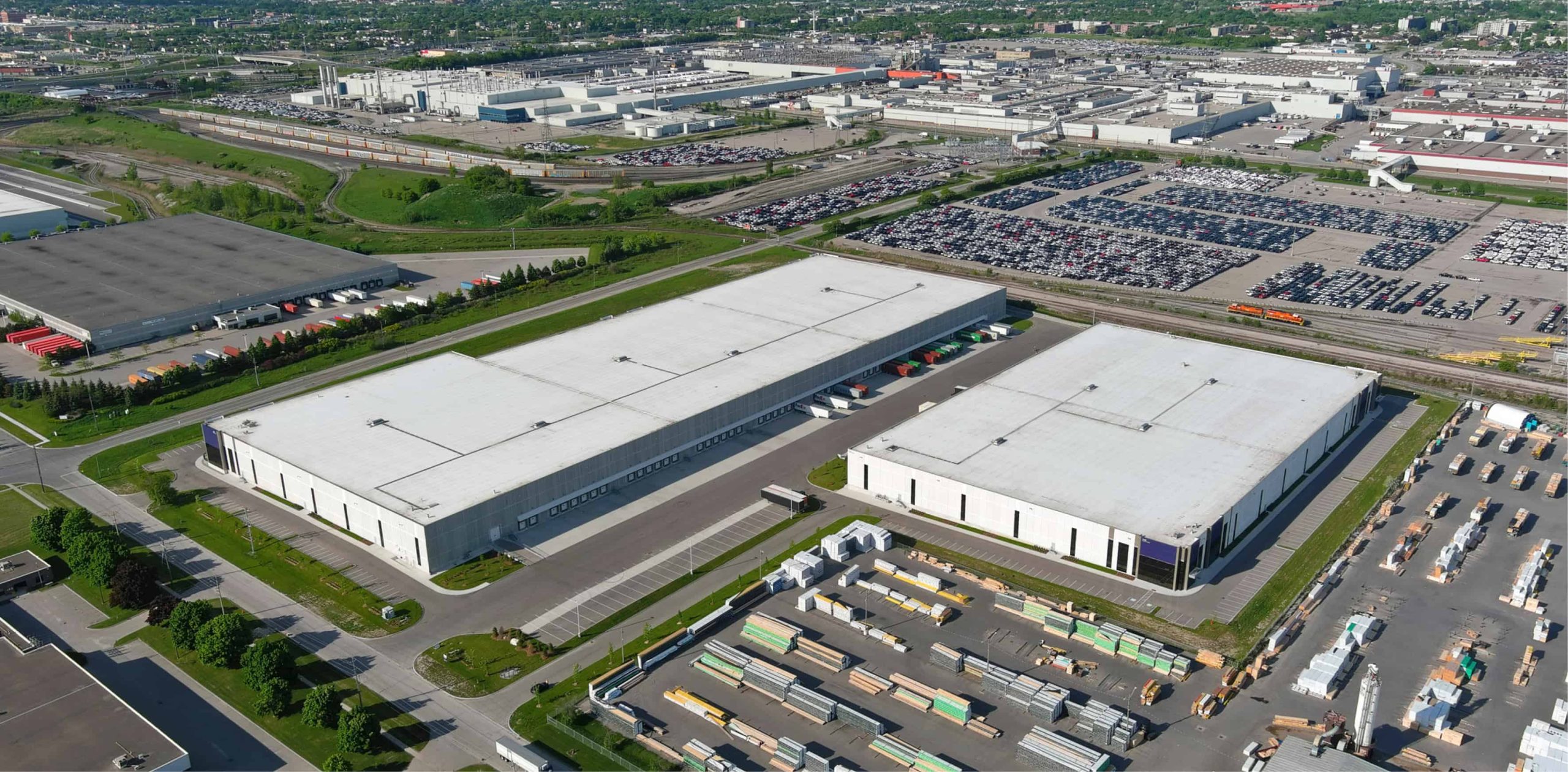 Architectural design and civil engineering services for two industrial buildings, totaling more than 630,000 square feet on a 27-acre site. With a focus on occupant wellbeing and comfort, the design ensures natural light flows into the warehouses through large, punched out windows. The rear building loading docks feature covered canopies that provide shelter from the natural elements. Drive-in doors and mechanical louvers allow natural air to flow through the warehouses. To create an environment that is accessible and useable by all, all entrances have barrier-free access and on-site bike racks to accommodate cyclists.