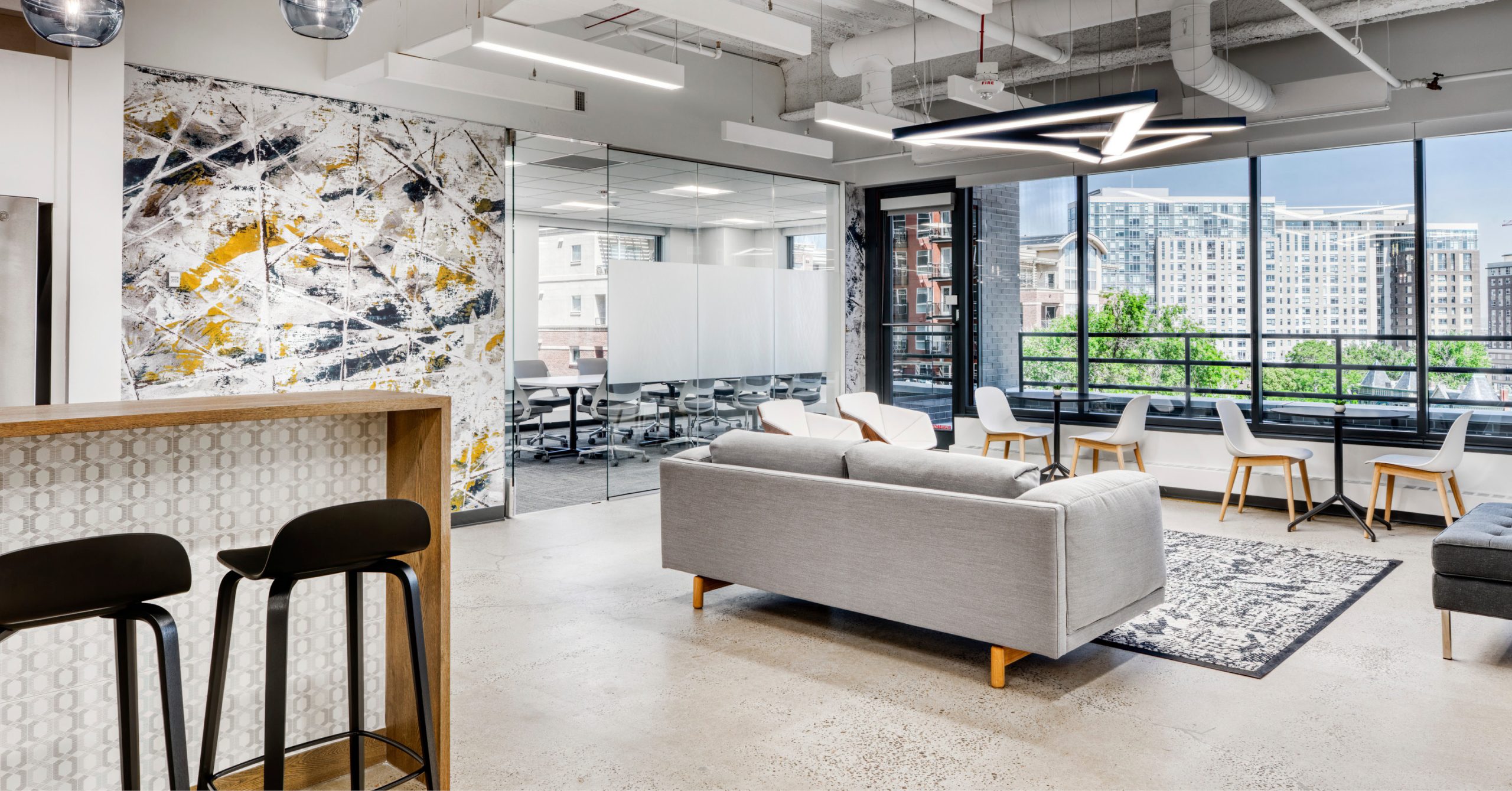 Architecture, interior design, and branding services for exterior upgrades, lobby updates, and tenant improvement to the spec suites. The exterior upgrades included accent paint, a mural painting, yellow fins with accent lighting, and updating the patio canopies. The project also included a “Regent Ready” spec suite program including floor-specific lounge amenities.