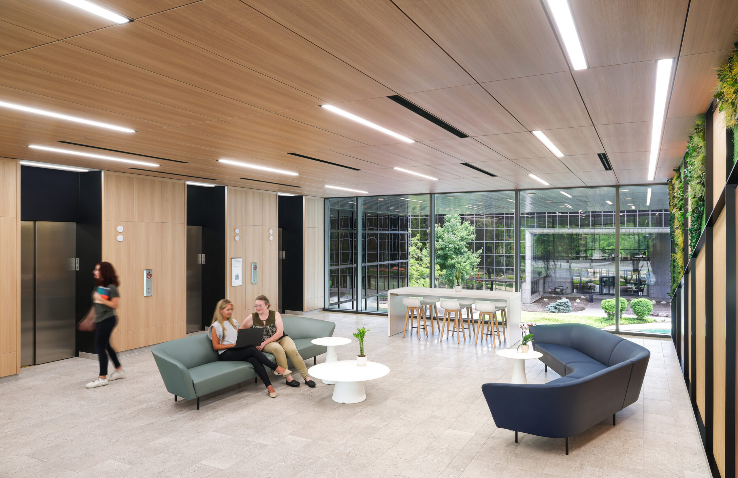 Interior architecture and design and branding services for the renovation of entry lobbies and common areas including full-service café and conference center for two buildings at The Arbors campus. The design focus was holistic in that the buildings are mirror images of each other and the design language carries seamlessly across both. It incorporated feature walls that visually align with one another across the courtyard and reflecting pool. They also incorporate natural materials such as wood paneling and preserved plant variations which are combined with a semi-reflective metal, bouncing off the natural daylighting and creating a dynamic and unique experience. The lobbies essentially become another building amenity and a destination with soft seating to enjoy the unique vistas of the campus.