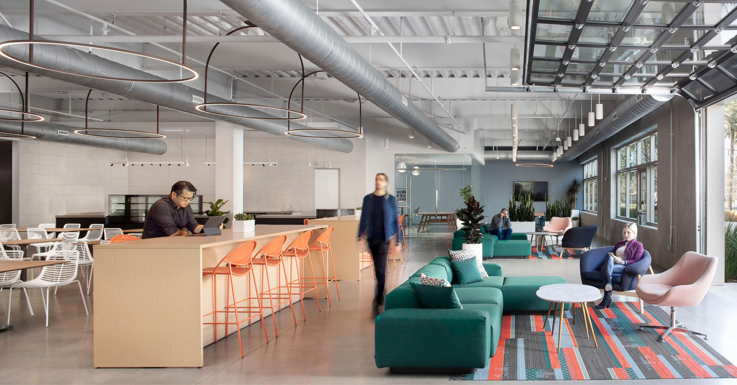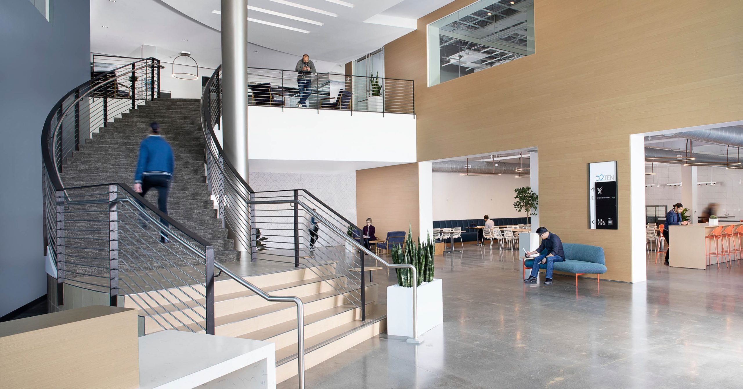Architecture and interior design services for renovations comprising of 21,700 SF within an existing 170,000 SF, two-story commercial office building. Interior scope included a new café space, tenant break-out and collaboration areas, gaming area, and addition of an exterior roll-up door to create an inside-out experience. Exterior improvements include vehicular drop-off area, landscape/hardscape, and upgrades to building entrance glazing and canopy.