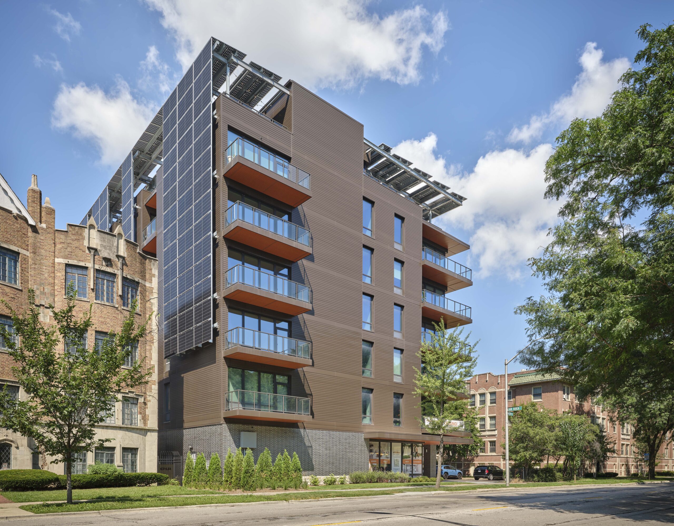 Power production is provided by a unique solar panel array that doubles as a shade structure over the roof deck featuring stunning views of downtown Chicago and Oak Park. The solar panels create a dynamic rooftop environment, blending energy production and education with an attractive amenity. Twenty percent of the building’s units will be reserved for individuals earning at or below 50% of the area’s median income, while the remaining 80% will be rented at prevailing market rates. This mixed-income concept, coupled with the building’s NetZero design, is part of the developer’s commitment to developing economically diverse and sustainable housing for the region.