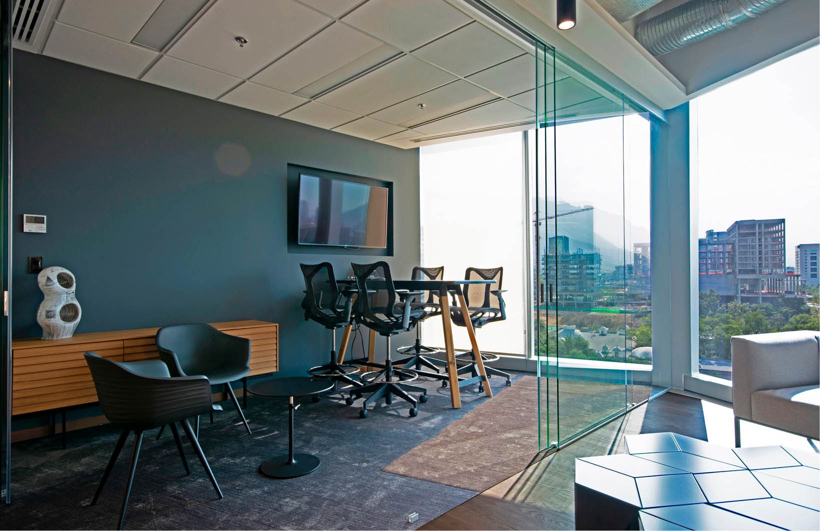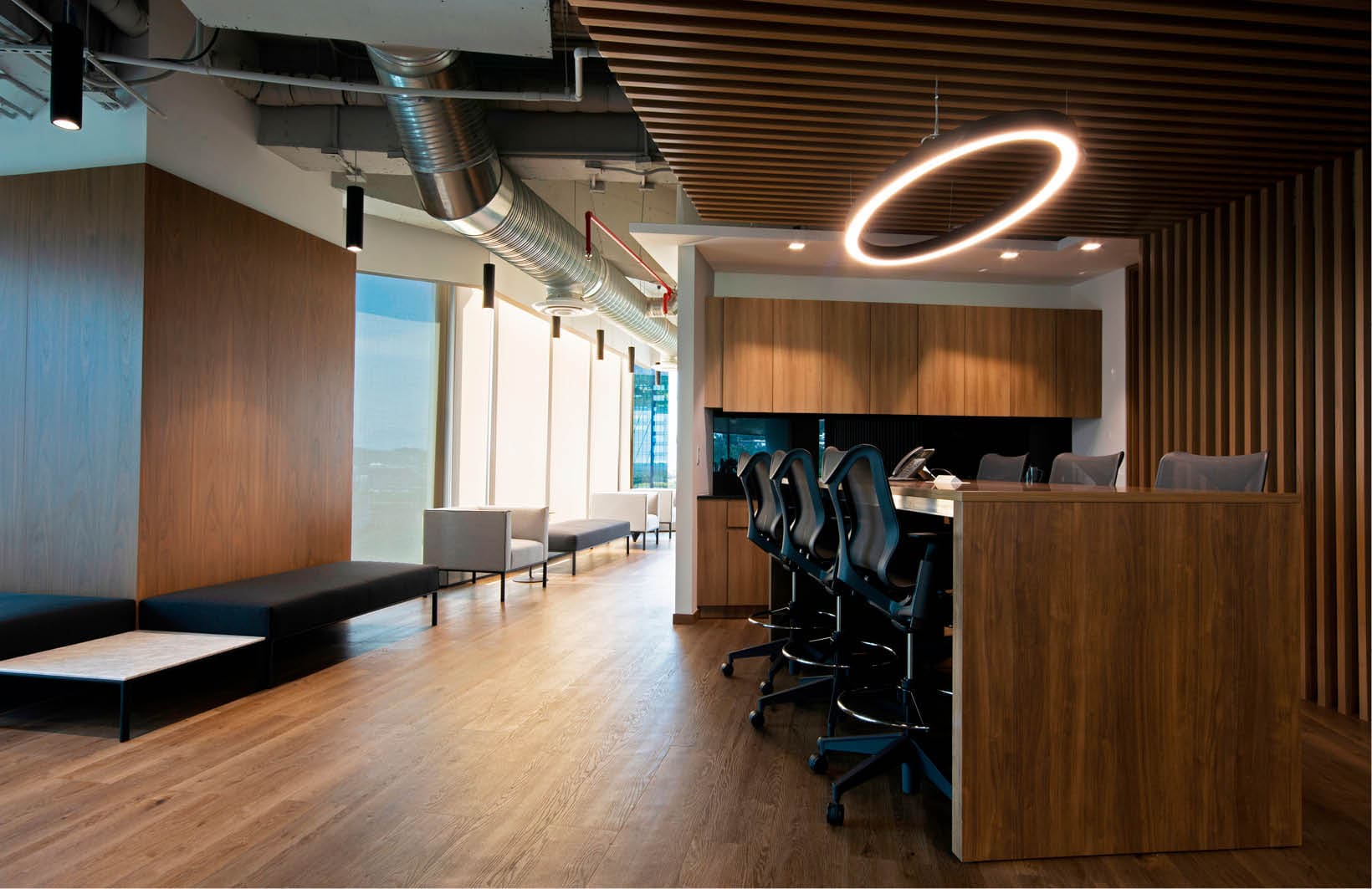Interior architecture & design services for a 3,800 SF office and features an open office environment with reception, multiple collaboration areas, a hospitality station which can be integrated with other adjacent spaces for teamwork, conference rooms of various sizes, private offices, phone booths, a print/copy station and a break room. The Alles Group wanted a space that could serve as a showroom for the firm’s industrial market expertise, as well as creating a warm and collaborative environment for employees, clients and visitors. The Alles Group is a leading brokerage firm.