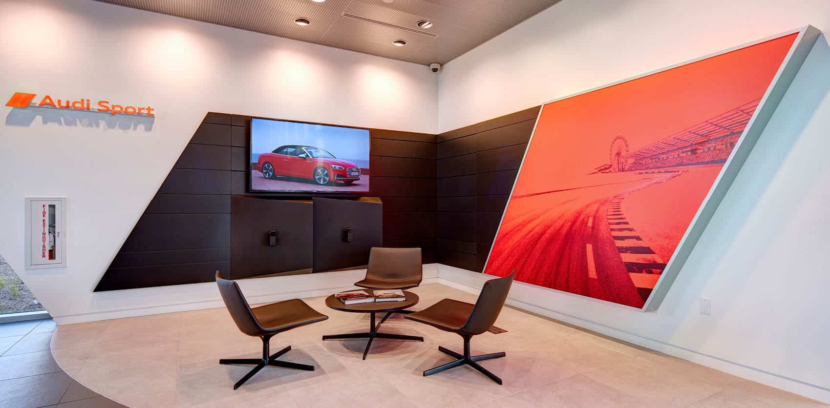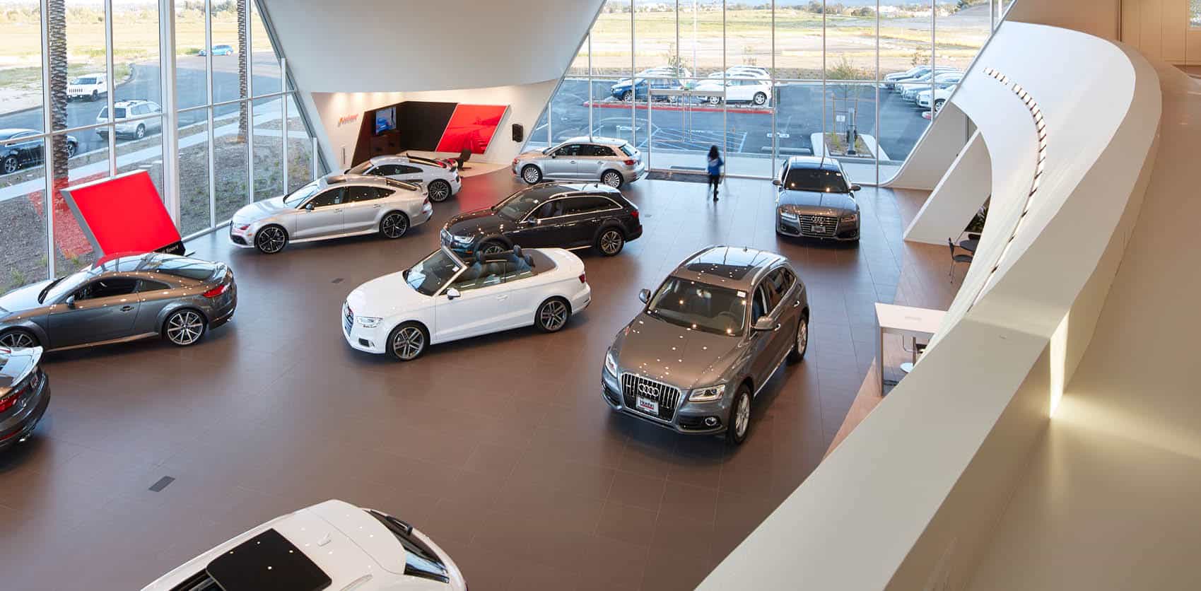 Architectural and interior design services for a new 40,000 SF full-service terminal auto dealership. The dealership includes a high-end 9 vehicle showroom, sales offices, lounge areas, retail boutique, and 166 site parking stalls. Additional spaces include a public Quattro café and an executive level with offices and a conference room as well as an additional public lounge area. There are 18 vehicle service and two wash/detail bays, an interior new car delivery room, a two-level parts department as well as an elevated three vehicle interior jewel box display with freeway frontage. This project meets the Audi of America Corporate design standards and all Cal Green sustainable building standards.