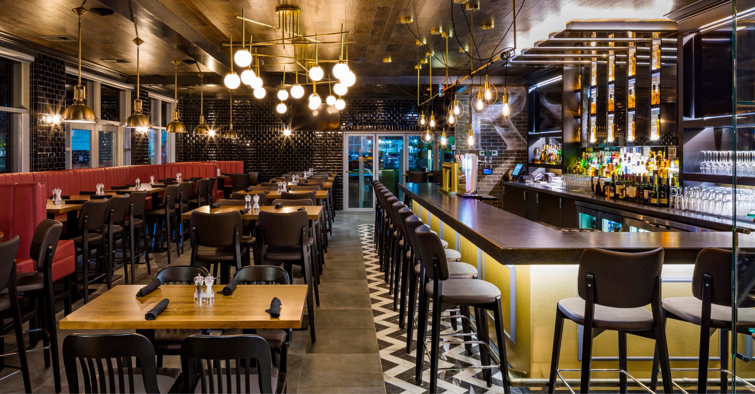 Architectural and interior design services for exterior and interior alteration to a 7,500 SF dine-in free-standing restaurant. The renovation included luxurious and modern finishes, light fixtures, custom millwork, reconfiguration of the dining and bar areas, as well as an exterior refresh including a coreflex patio door and a update to the patio and building facade.