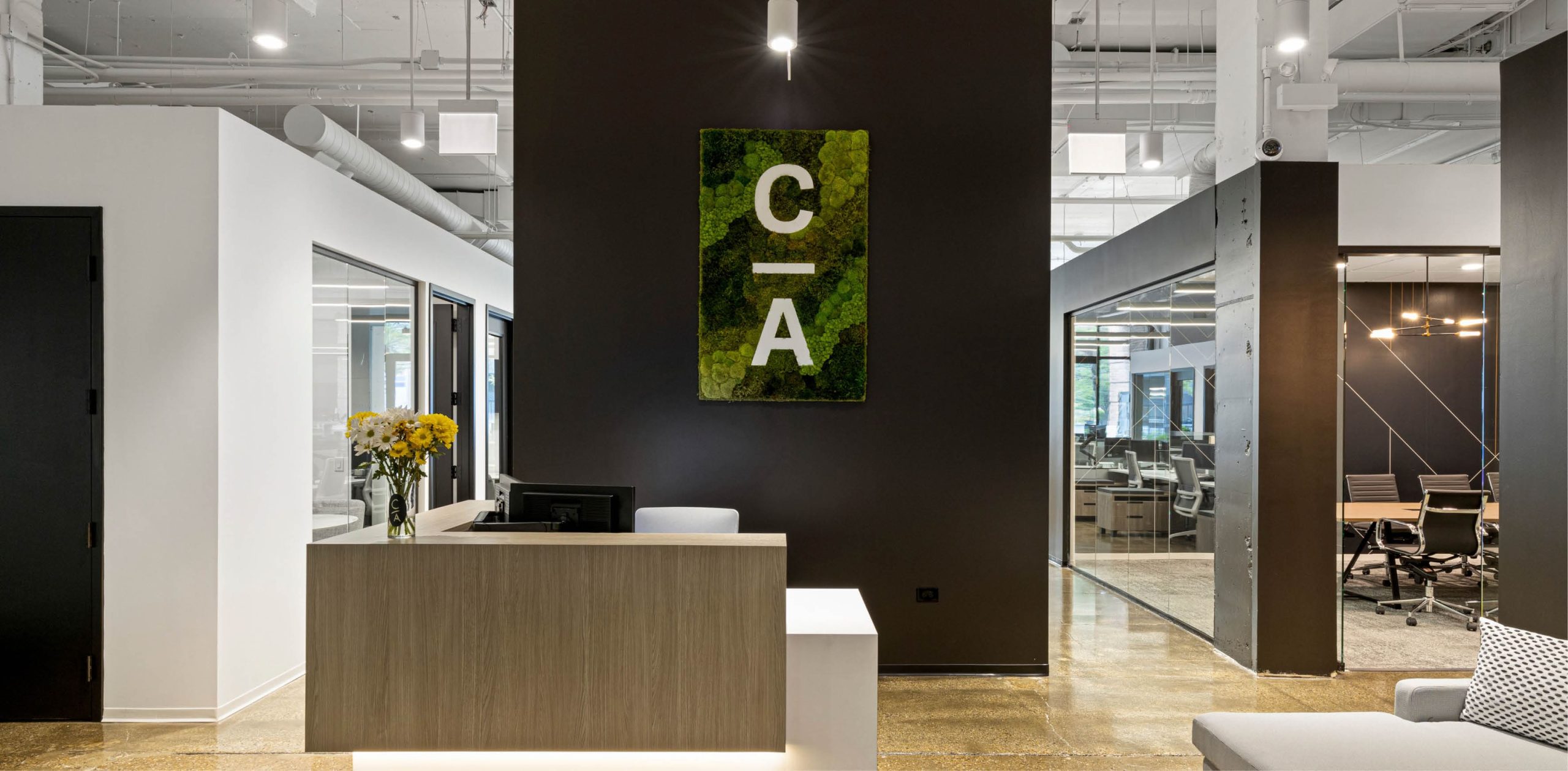 Interior architecture, design and furniture management services for CA Fortune’s relocation to the West Loop. The interior floor plan contains an efficient tech-type set up for workstations, in-board offices and huddle rooms, phone rooms, and an open work cafe while allowing team members an escape to the outdoor patio space to relax and recharge. Ware Malcomb also collaborated with CA Fortune’s creative marketing team to develop a branded design and story within the space.