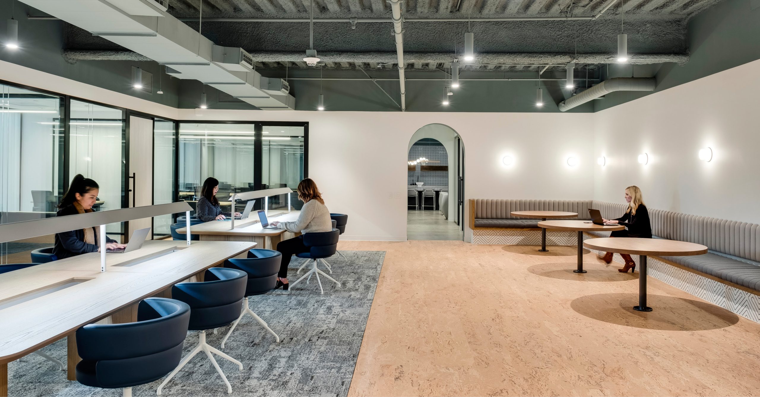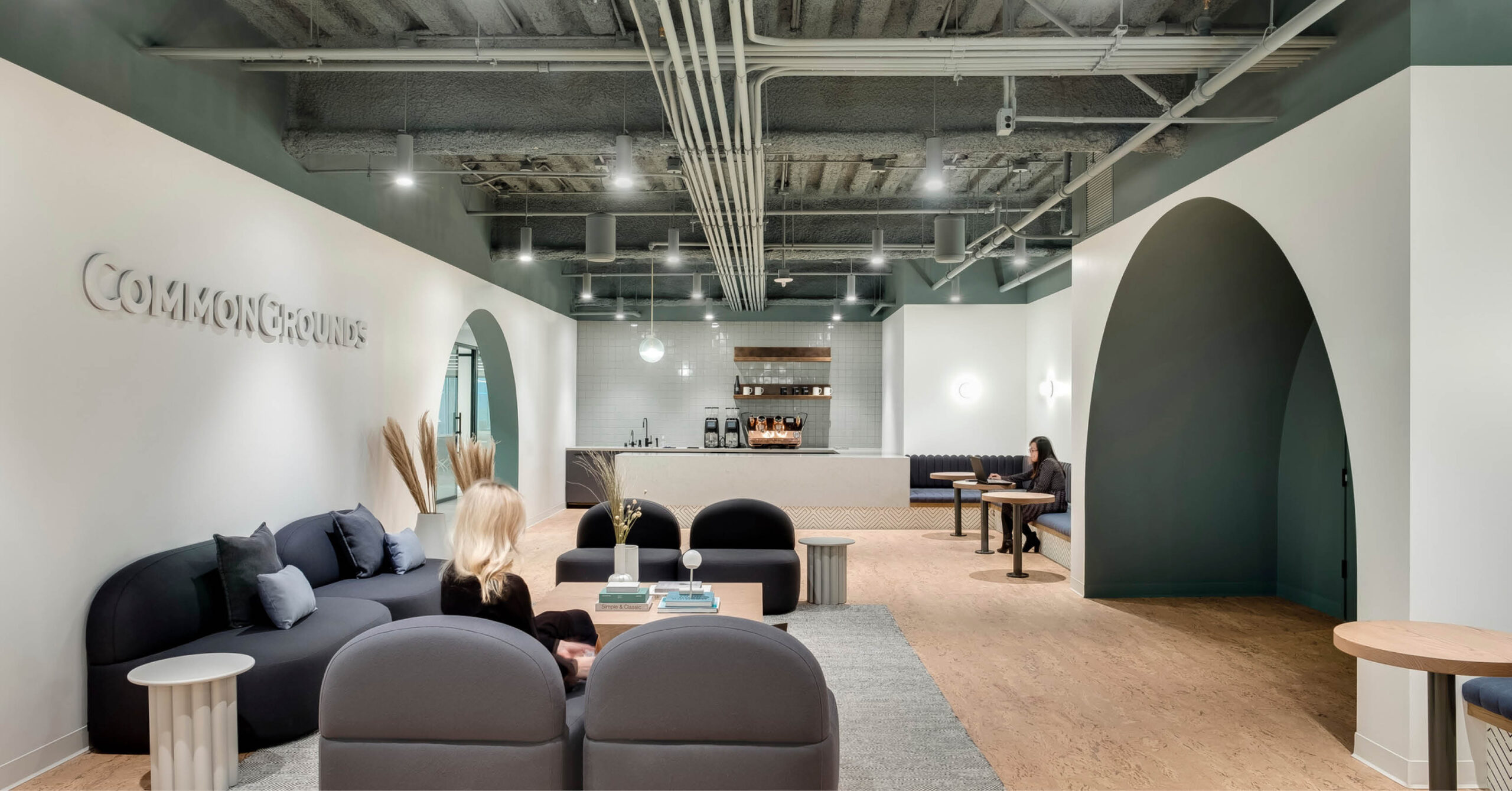 Interior architecture and design services for a 40,000 SF tenant improvement for CommonGrounds Workspace, a coworking environment with plentiful private working spaces, shared common areas and custom in-house cafes.