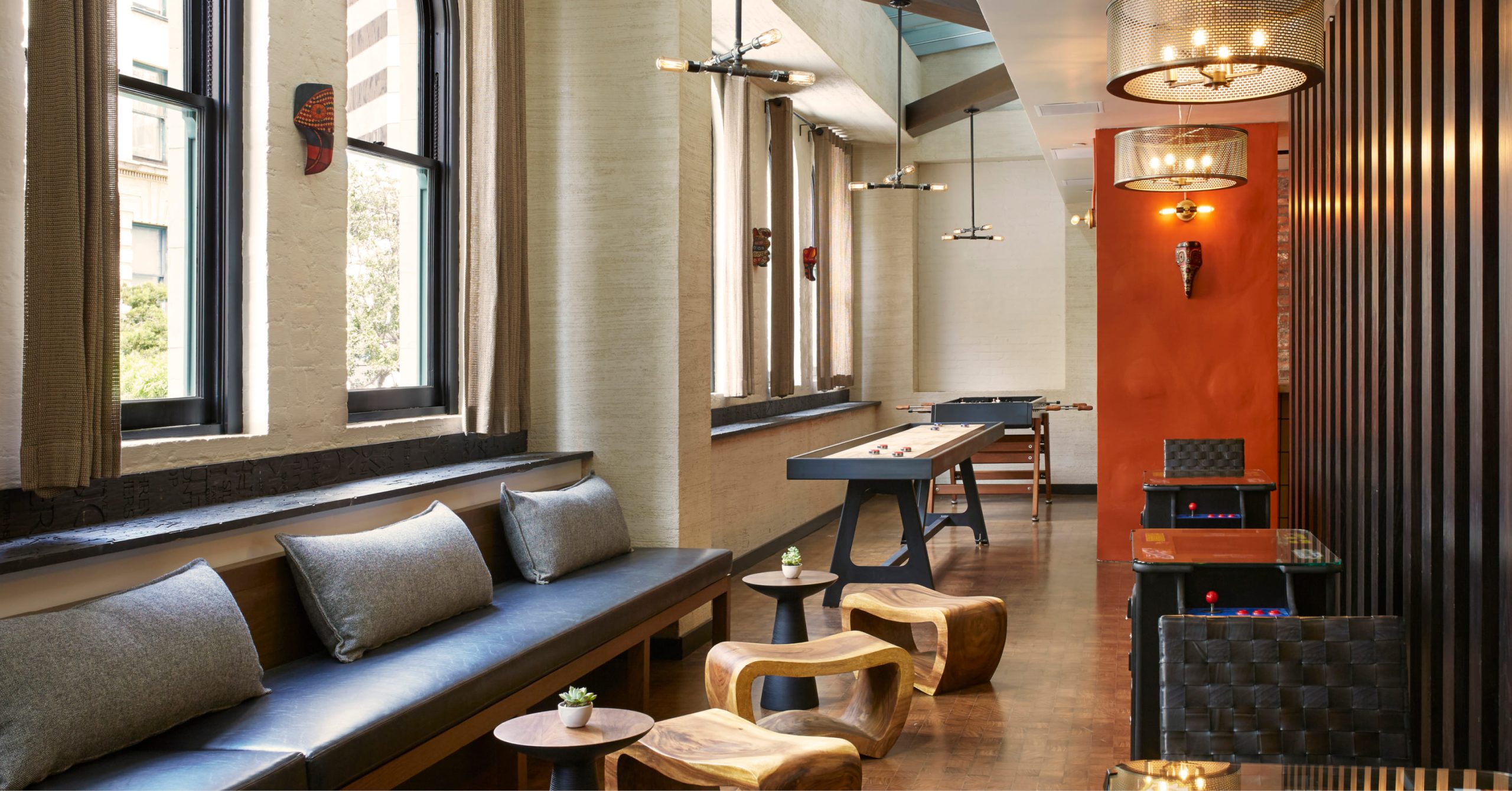 Architect of Record for restaurant renovation at the Hotel Palomar in Downtown San Diego. The Hotel Palomar’s new restaurant concept, named Curadero, serves Mexican street food in a relaxed, fun atmosphere. The second floor Arriba Room is an exciting space to hang out featuring a late-night taco window, vintage arcade games, foosball, shuffleboard, and other activities. Mexican-themed artwork and design are woven throughout the space.