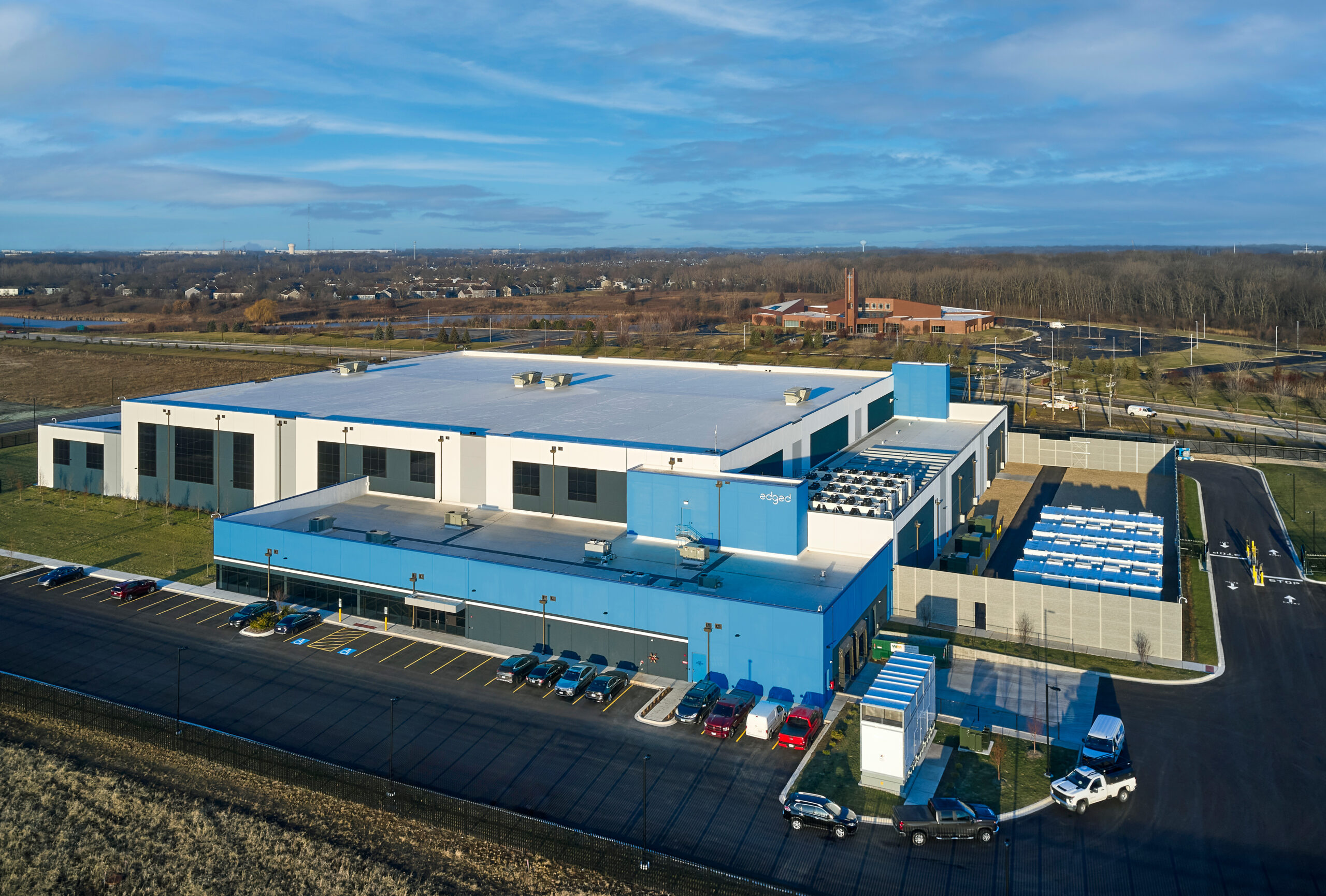 The office area includes a welcoming lobby, conference room, and break room, while the data center is designed for high-performance functionality and future tenant flexibility.