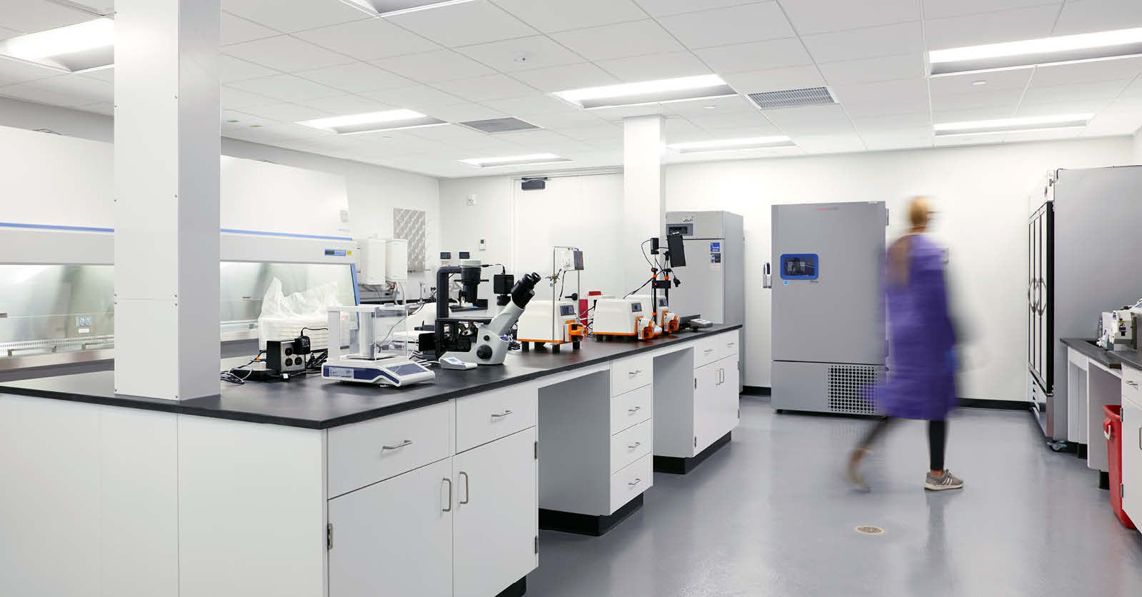Architecture, interior design, MEP, structural, and civil engineering, and lab planning services for a 43,000 SF life sciences facility. The facility includes 38,000 SF of lab space and 5,000 SF of office space, consolidating multiple teams into a single location. A phased construction approach supported early occupancy and accommodated varied operational needs. Scope also included AV/IT/Security.