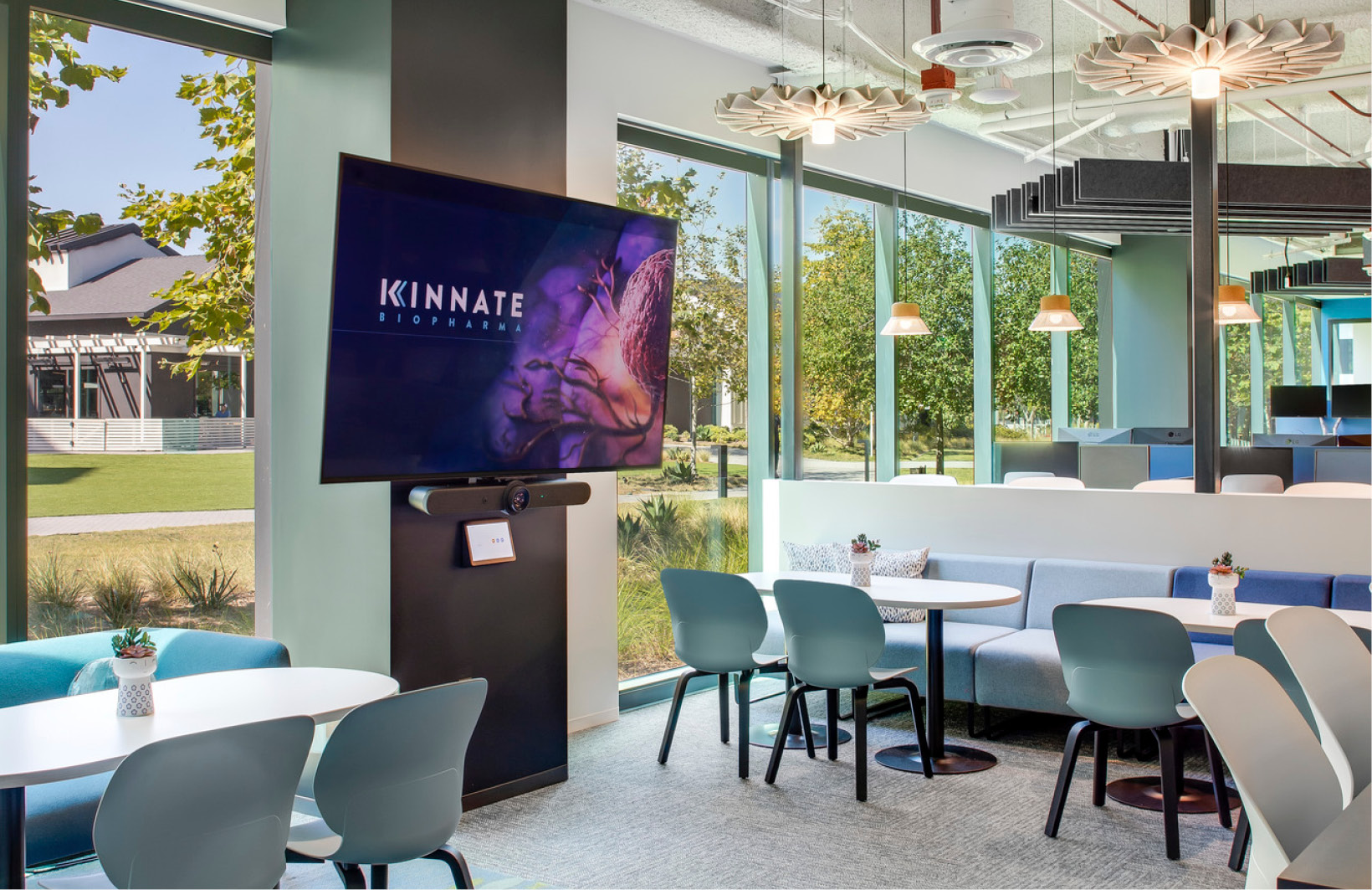 Interior design and branding services for a 7,000 SF fully-agile creative office space. The space is designed with a focus on a variety of places for employees and clients to meet, as opposed to dedicated personal offices or workstations. A hybrid workplace, Kinnate encourages its employees to use the office for collaboration and save “heads-down” work for home. When in the office, employees can sit anywhere to plug in for short periods of time between meetings, and options range from lounge seating configurations to bar height seating. A small number of hoteling workstations are provided for employees visiting from other locations or team members working in the office for longer periods of time.