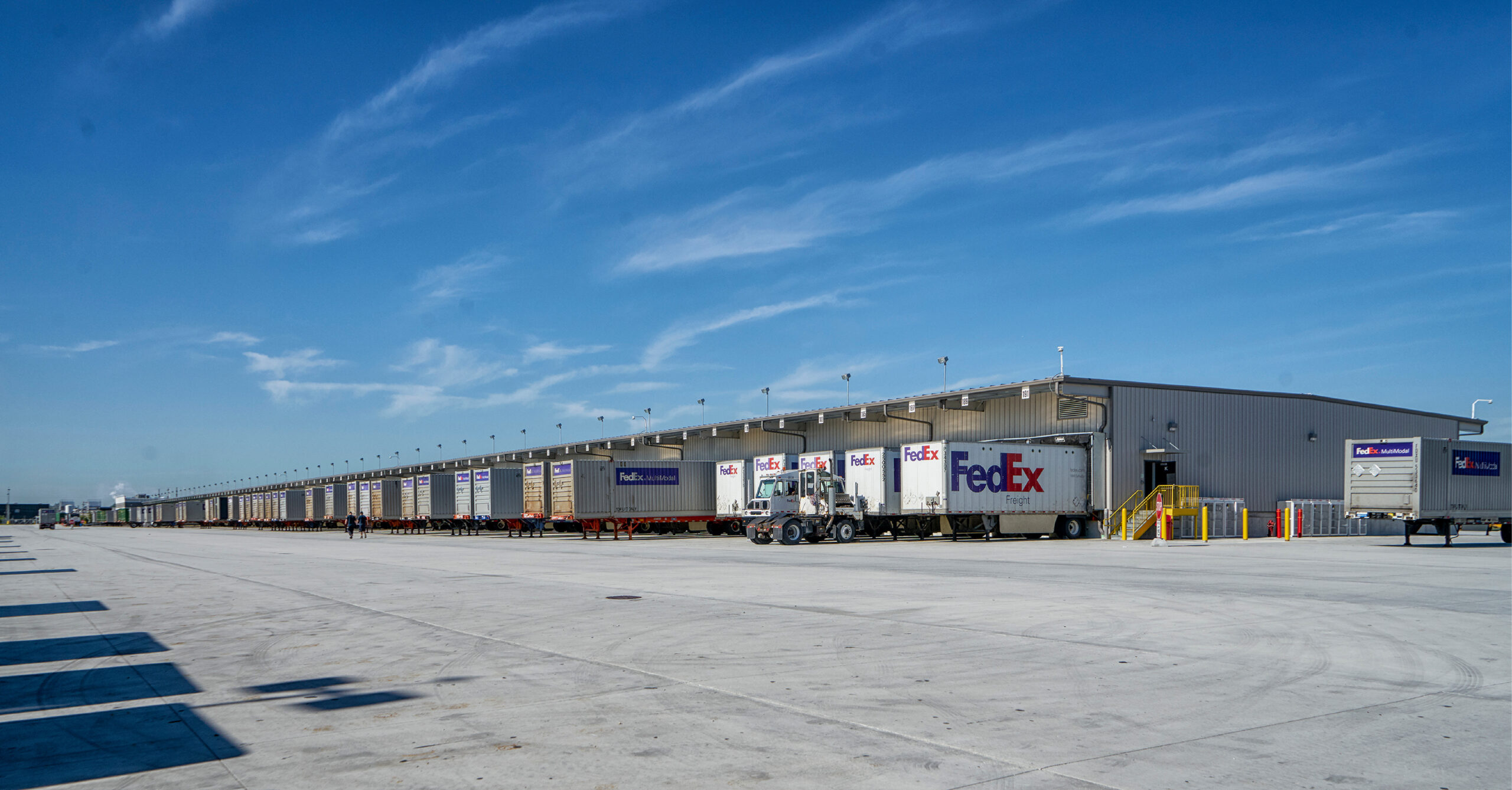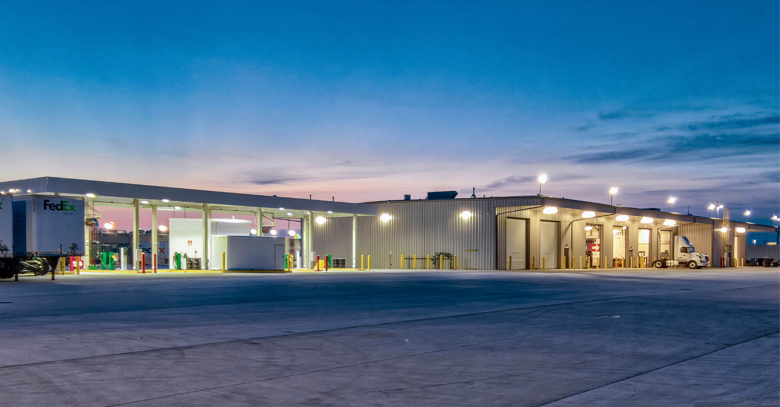 Architectural design services for a 152,000 SF dock building with a 13,000 SF office component, 22,000 SF vehicle maintenance building, and a 3,000 SF fuel bay canopy with lube shed. The project was built using a pre-engineered metal building combined with an architectural precast office building.