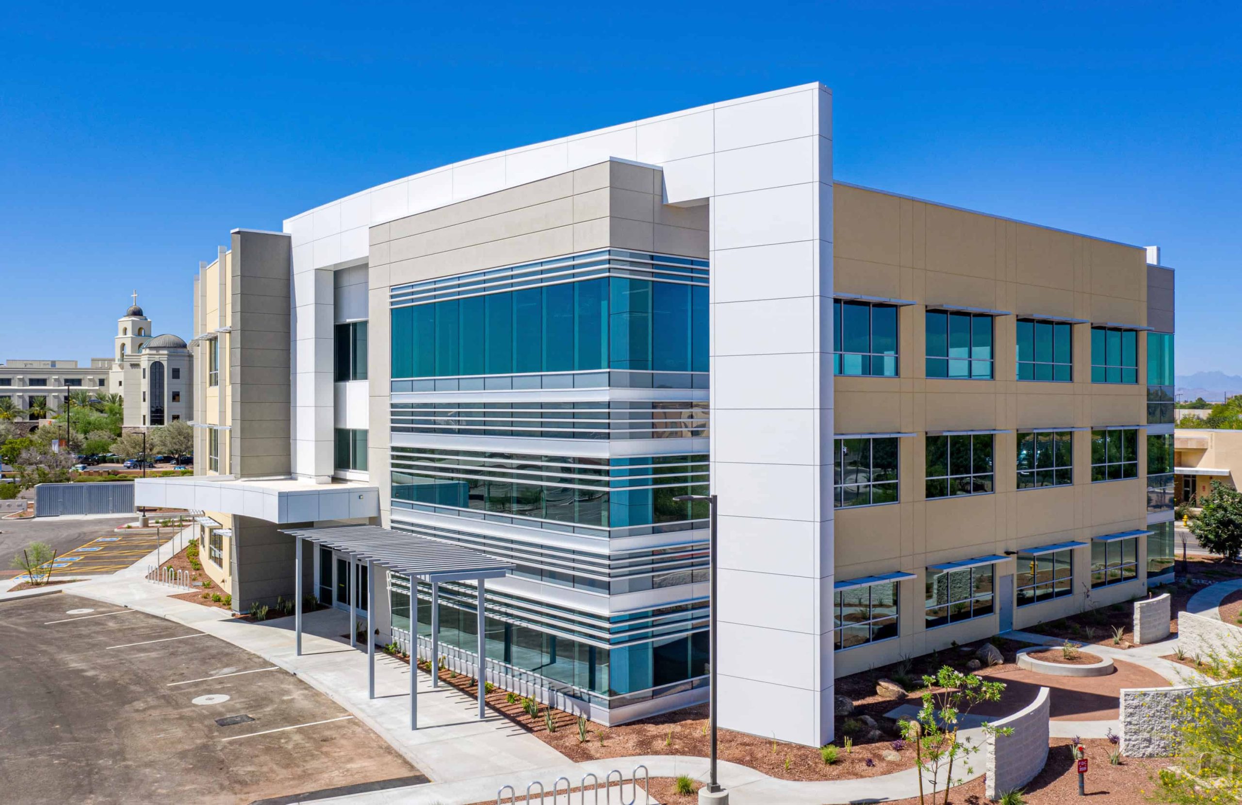 Architecture and interior design services for a 3-story, 58,650 SF medical office building housing a physician assistant and two orthopedic surgeons. Mercy Medical Commons shares a site with a previously developed building, so our team designed the space to compliment the existing building with access and adjacency. The site has a curved road frontage and the building responds with a 3.5 story wing wall that is integrated into the building design. This strategic design provides prominent presentation of signage for the tenants and compliments the primary entrance to the Mercy Medical Hospital across the street.