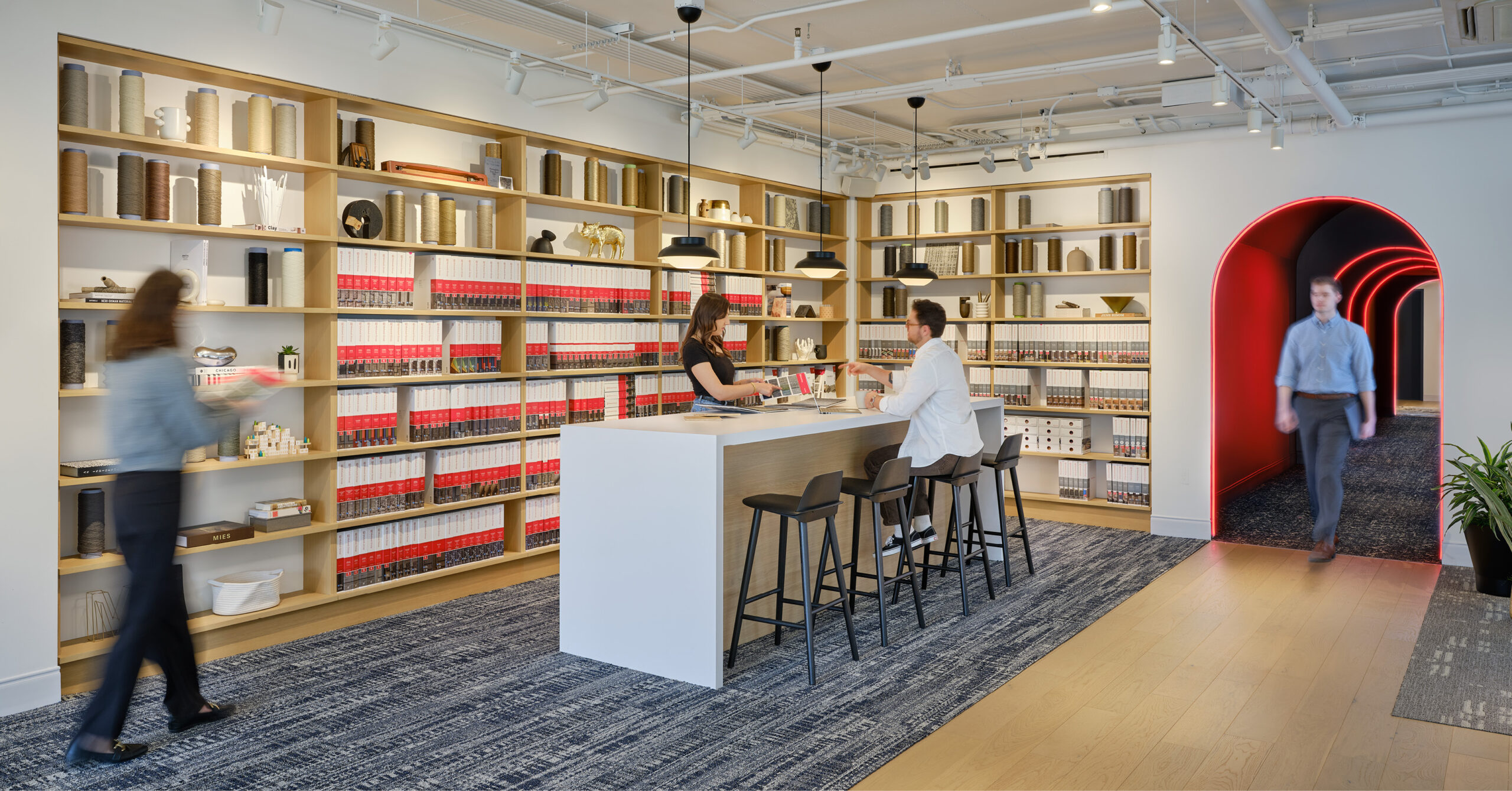 Mohawk Group’s new showroom brings hospitality-inspired design to the workplace, creating a dynamic setting for the Chicago architecture and design community, client events, and daily work. Visitors are welcomed by a cozy lounge and guided through a dramatic corridor into a bright, expansive showroom anchored by custom seating and a central hospitality bar. A dedicated maker room features Mohawk’s Personal Studio, where clients can design custom carpets and watch samples tufted in real time. Beyond the showroom, flexible workspaces and integrated storage support the local sales team, making this space both inspiring and highly functional.