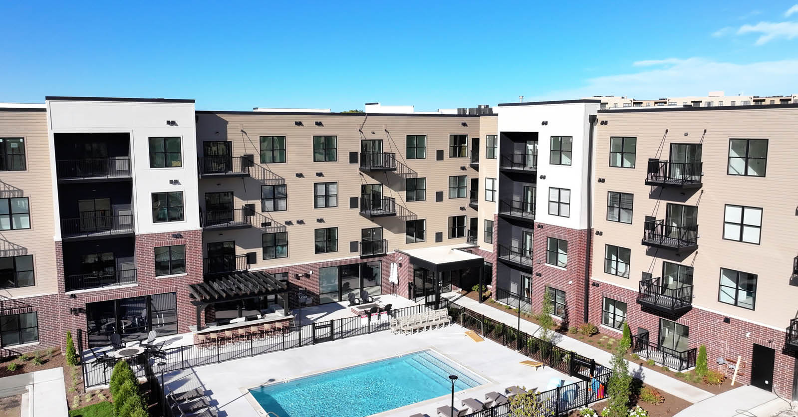 Architecture and interior design services for Station 250, a 166-unit, transit-oriented luxury multifamily development adjacent to the village hall in Mundelein, IL. The project consists of a four-story wood-frame construction with tuck-under garages, providing a density of 52 units per acre. It also offers 10,700 SF of indoor amenity space, including a fitness room, coworking lounge, sauna, and golf simulator.