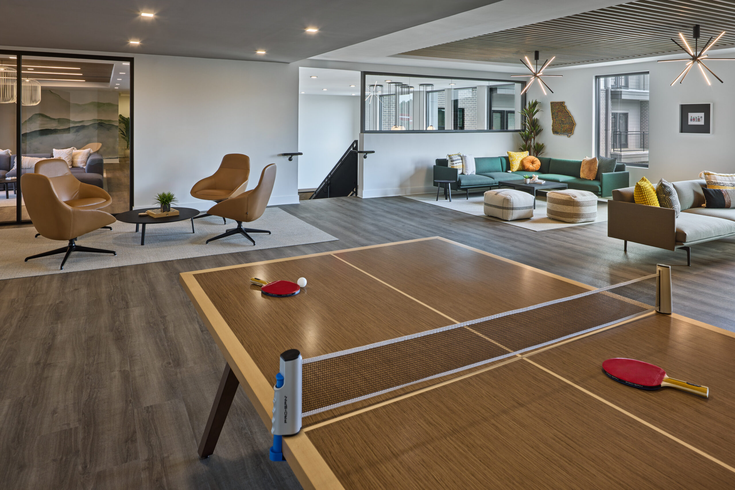 The client wanted to create a space that impacts the community and allows residents to work in different areas in the building. Unique wall coverings were used throughout the spaces, watercolors were chosen to connect residents to nature, making each space inviting for tenants and guests.