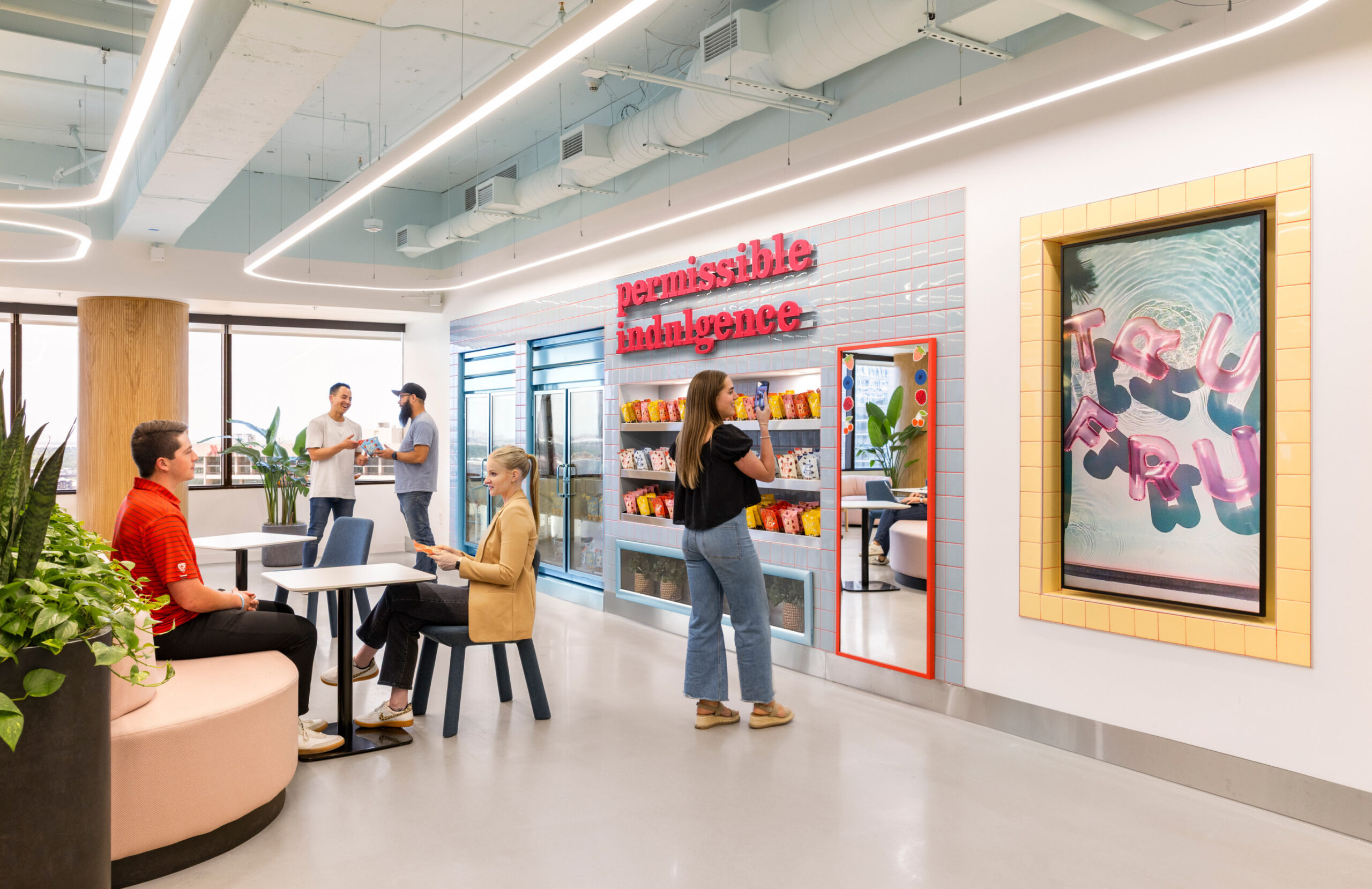 Architectural, interior design, and branding services for Tru Fru’s new 20,000 SF workplace. The design focuses on creating a flexible, activity-based environment that embodies Tru Fru’s innovative brand identity and culture. The space includes a cafe, TikTok studio, test kitchen, wellness room, and multiple collaboration zones each thoughtfully designed to support daily operations, creative content production, and marketing initiatives.