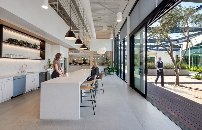 The headquarters brings over 500 employees together in a cohesive environment that supports teamwork, innovation, and brand development. The thoughtfully designed workstations and open collaboration zones encourage collaboration and spontaneous brainstorming sessions, while the serene aesthetics and inspiring surroundings reflect the Vuori coastal California lifestyle brand. The neutral design palette allows Vuori’s vibrant apparel to stand out, while natural light and airy layouts including open loft workstations and large sliding doors encourage well-being and creativity. The large double ceiling height lobby with stadium seating serve as an active gathering space for yoga classes, breathwork, and teambuilding to bring a sense of mental and physical health into the workspace.