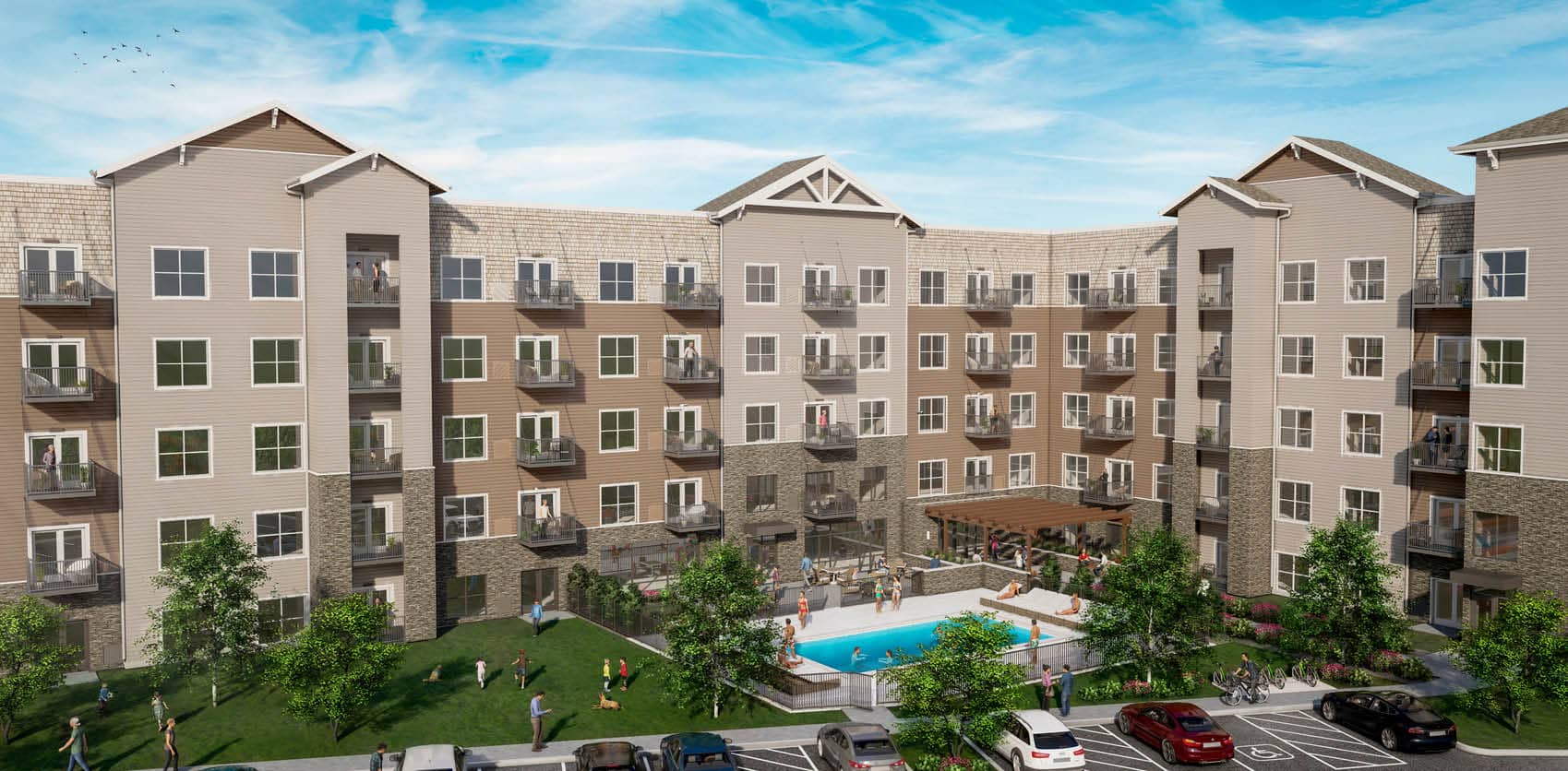 Architecture and interior design services for a 5-story multifamily building. The building contains 163 units total with approximately 31,900 SF per floor. The project also includes 266 parking stalls.