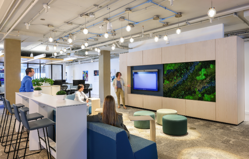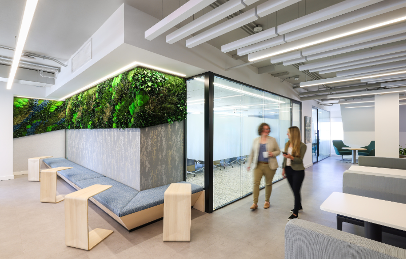 Biophilic design, including living plants, is incorporated by strategically placing preserved greenery in areas where employees socialize. A private roof terrace allows for outdoor breaks during the workday, and the space was designed to provide natural light to as many spaces as possible.