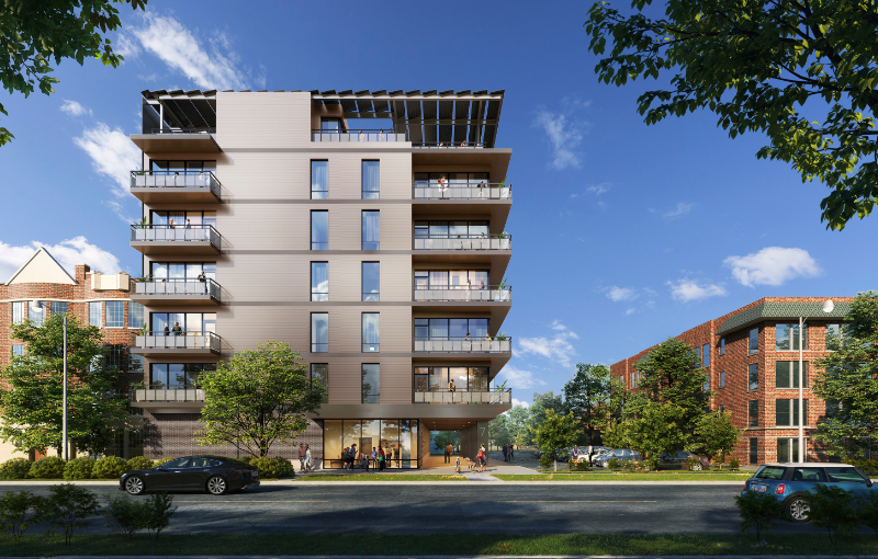 Power production is provided by a unique solar panel array that doubles as a shade structure over the roof deck. The solar panels create a dynamic rooftop environment, blending energy production and education with an attractive amenity. Twenty percent of the building’s units will be preserved for individuals earning at or below 50% of area median income (AMI), while the remaining 80% will be rented at prevailing market rates. This mixed-income concept, coupled with the building’s NetZero design, is part of the developer’s commitment to developing economically diverse and sustainable housing for the region.