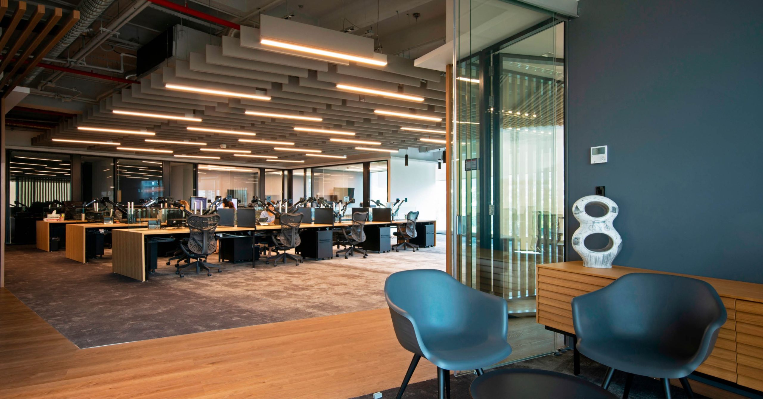 Interior architecture & design services for a 3,800 SF office and features an open office environment with reception, multiple collaboration areas, a hospitality station which can be integrated with other adjacent spaces for teamwork, conference rooms of various sizes, private offices, phone booths, a print/copy station and a break room. The Alles Group wanted a space that could serve as a showroom for the firm’s industrial market expertise, as well as creating a warm and collaborative environment for employees, clients and visitors. The Alles Group is a leading brokerage firm.