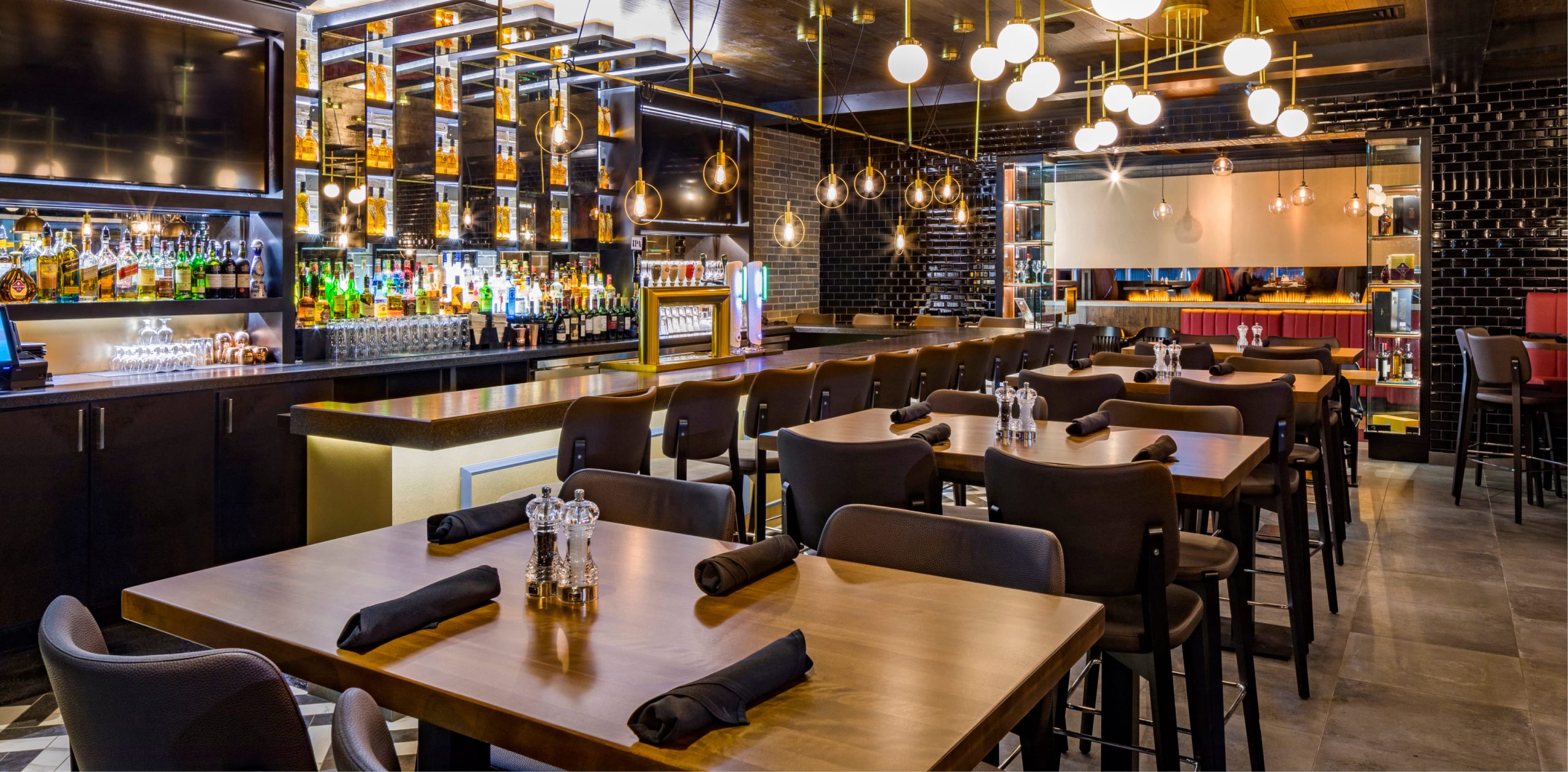 Architectural and interior design services for exterior and interior alteration to a 7,500 SF dine-in free-standing restaurant. The renovation included luxurious and modern finishes, light fixtures, custom millwork, reconfiguration of the dining and bar areas, as well as an exterior refresh including a coreflex patio door and a update to the patio and building facade.