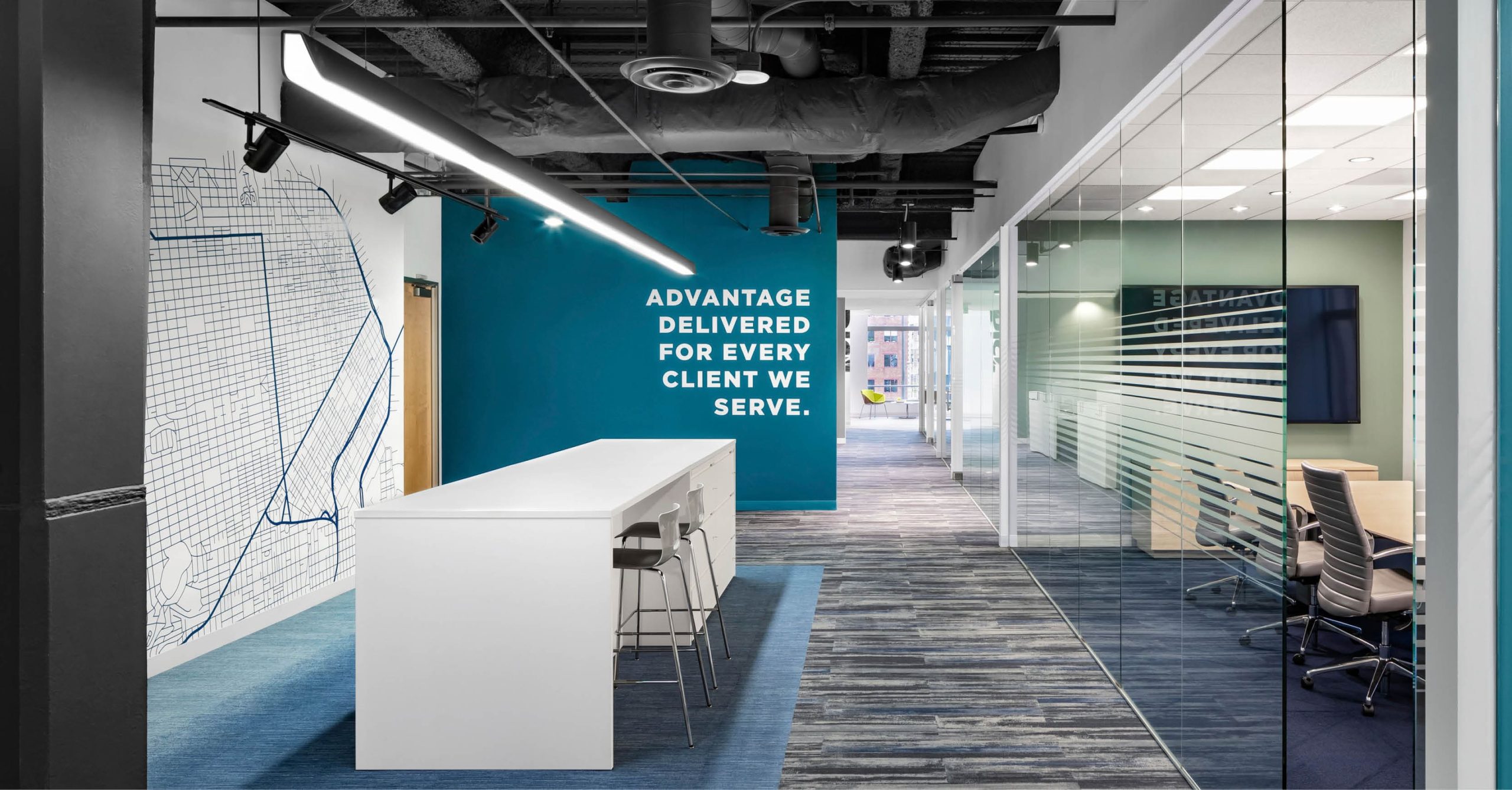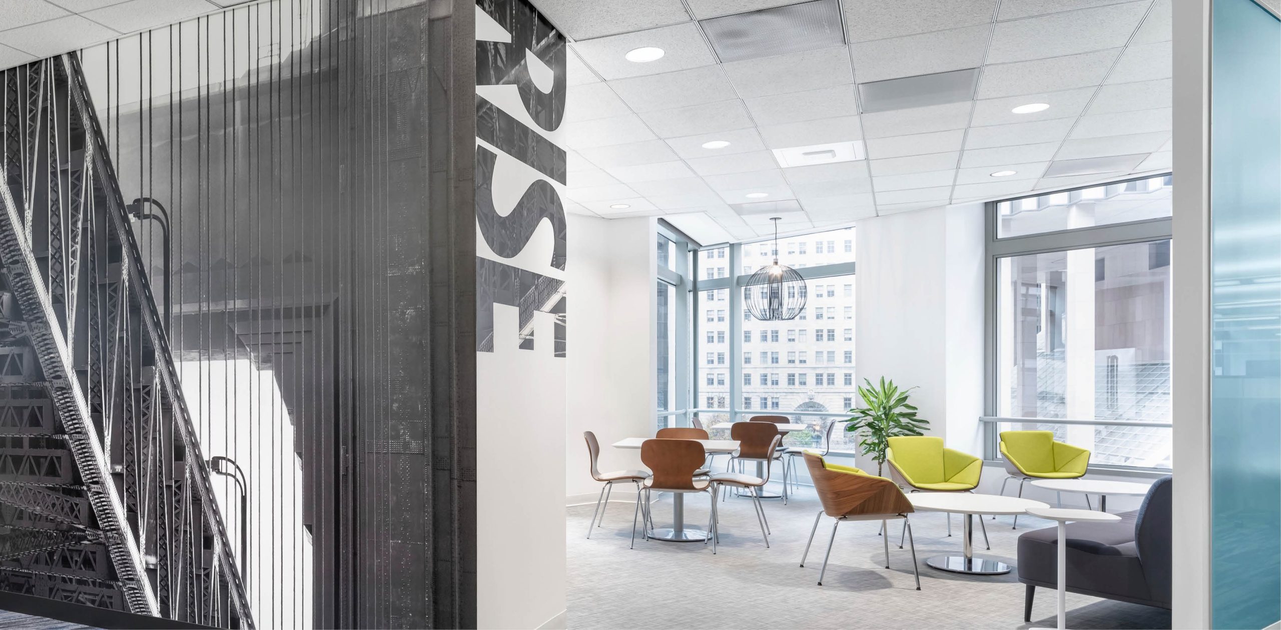 Interior architecture and design, branding and furniture selection services for 14,000 SF of office space for CBRE’s asset management division. The space features a modern, open office design concept with a variety workspace options including open and enclosed meeting areas and two open café/break out areas to foster employee engagement. Branded graphics are integral to the design, with CBRE’s core messaging and new workplace initiative guidelines incorporated throughout the space, including a custom acrylic display of the San Francisco skyline, privacy film for offices and conference rooms, a large map of San Francisco and a graphic for their break room titled “rise”, integrating imagery of the Golden Gate Bridge. The branding design drew inspiration from San Francisco and highlights CBRE’s focus on customer service and local reach.