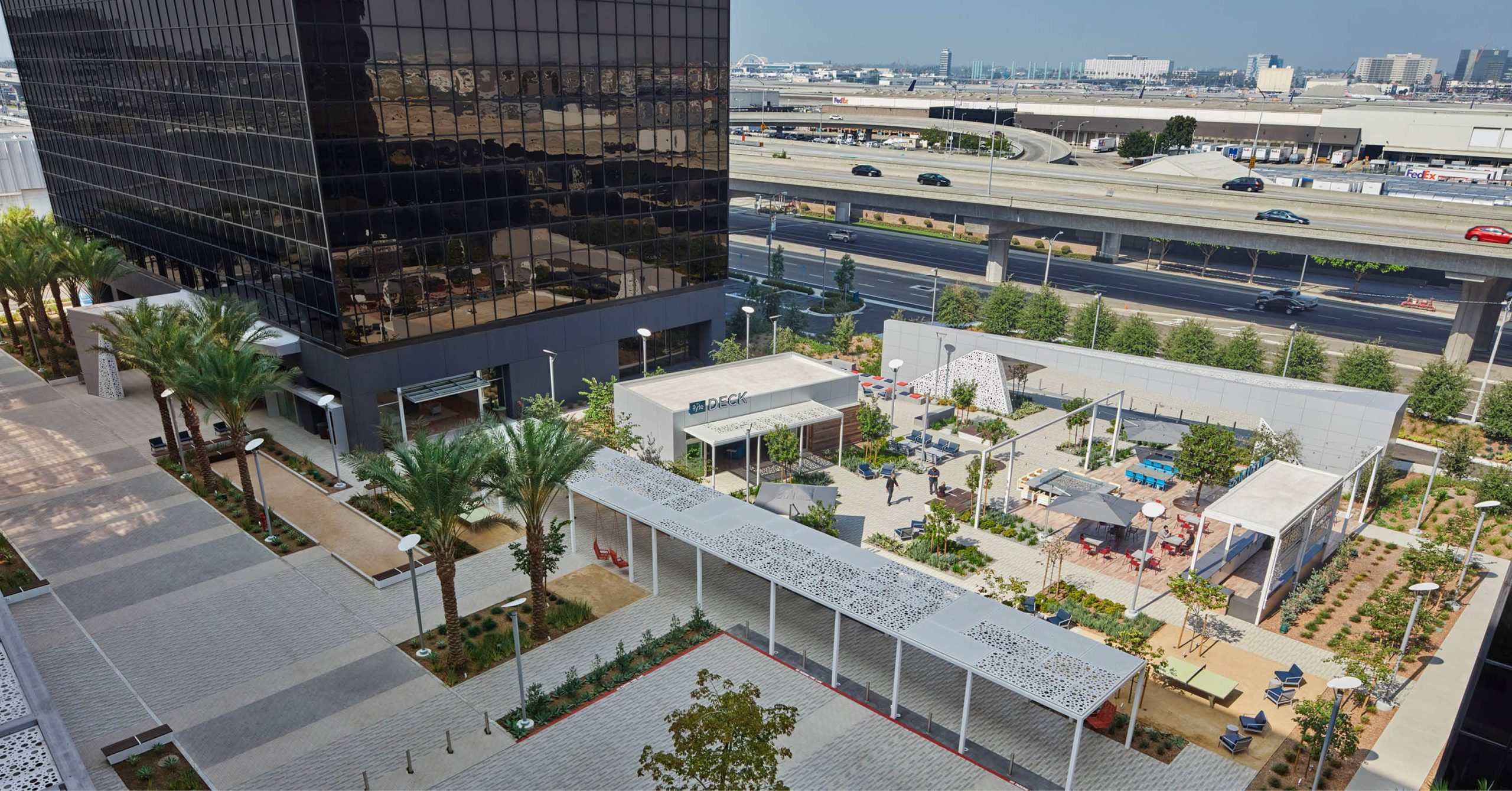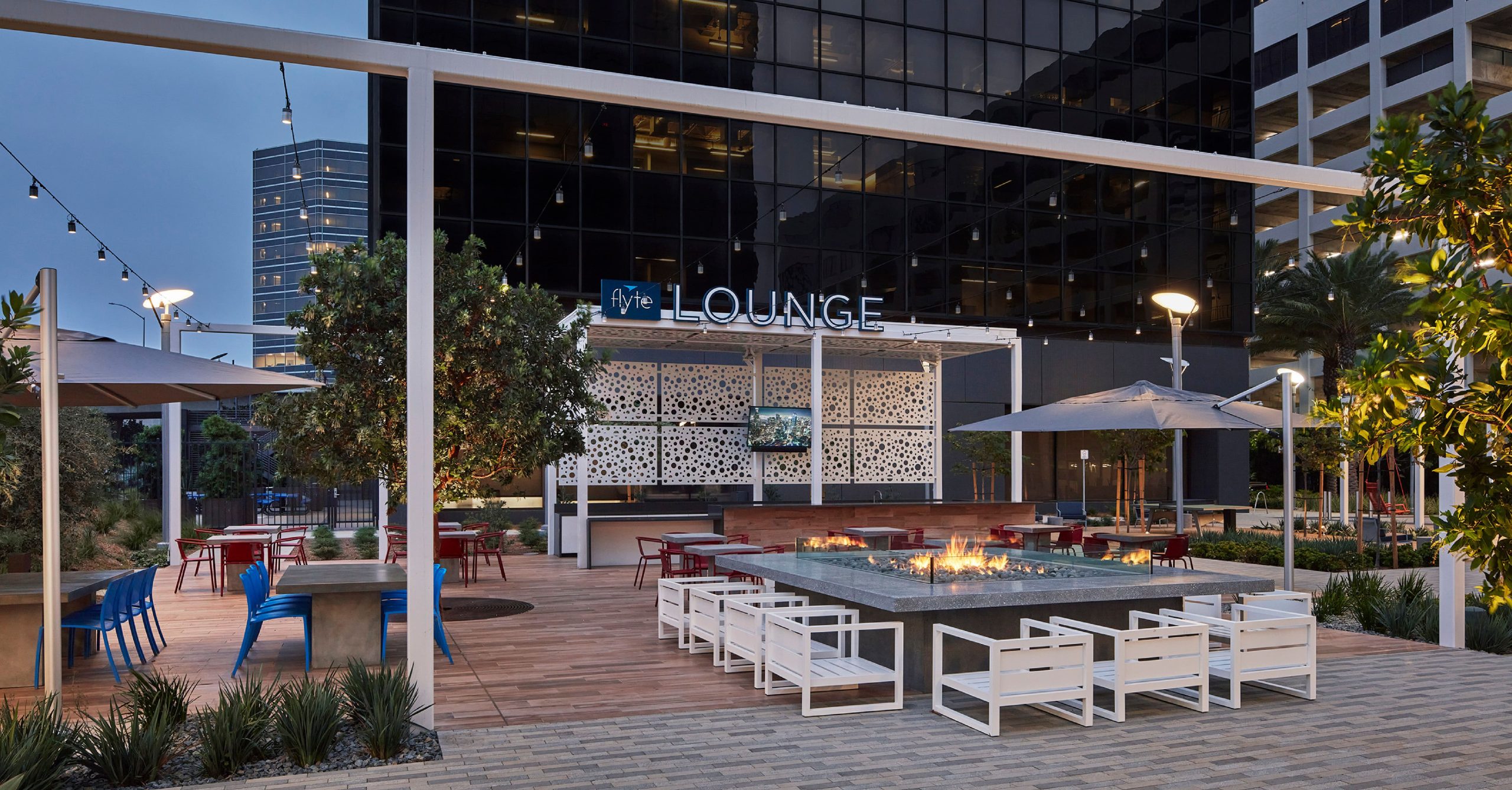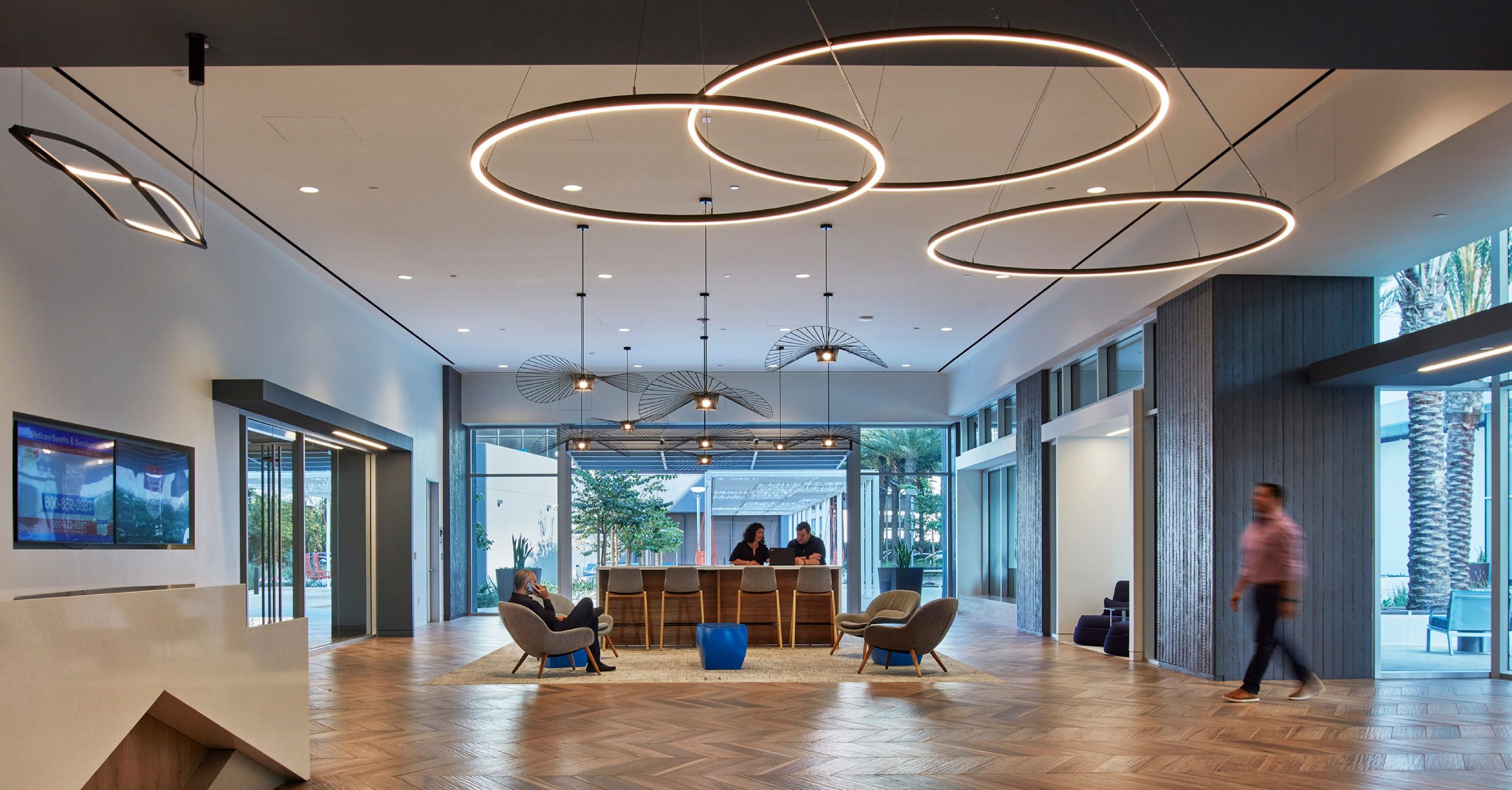 Architecture, interior design and branding services for the exterior and interior renovation of two office building totaling 581,344 SF. The transformation offers two tenant-occupied office towers and a newly constructed plaza with modern common areas nestled in between. Ware Malcomb’s design team sourced materials that added texture and interior dimension. Upgraded finishes included metal, stone and wood which were elevated with unique lighting fixtures and a neutral color palette. The buildings feature upgraded lobbies, elevators, restrooms and common space foyers, state-of-the-art event spaces available to both tenants and the community, collaborative indoor-outdoor workspaces throughout with Wi-Fi access and food kiosks. The branding team worked closely with Swift’s construction and property teams to plan, design and coordinate the implementation of exterior site signage to support the repositioning and rebranding of the campus to Flyte. The exterior signage is integrated into the site and complements the architecture while providing campus identification and wayfinding. This project earned an Award of Merit from the American Society of Landscape Architecture (ASLA) in Southern California.