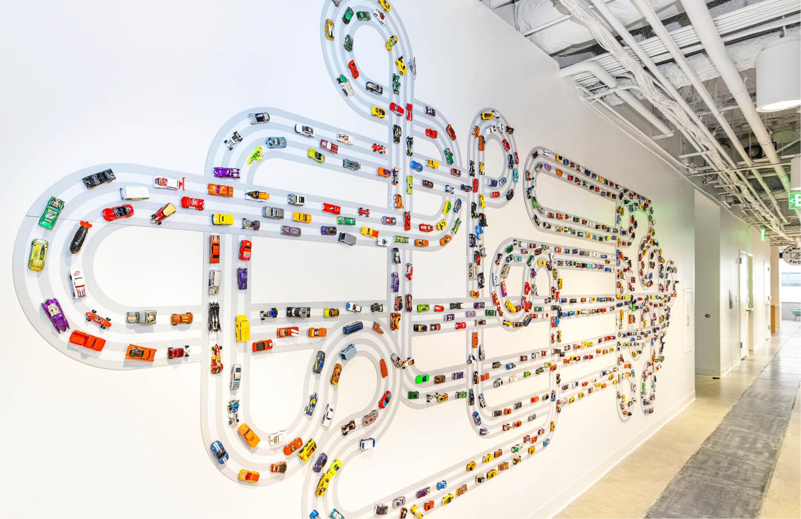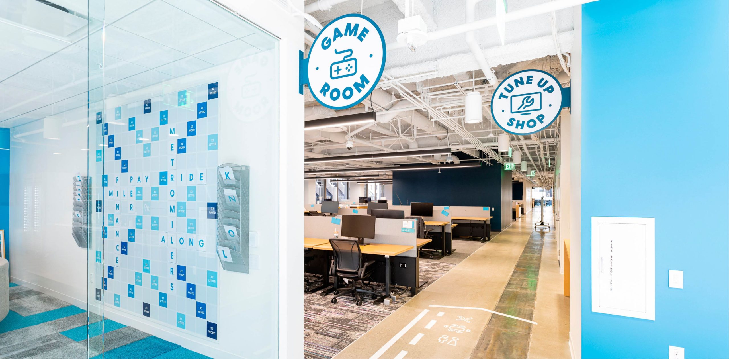 The space plan incorporated a full-floor open office layout with several private offices, creative collaborative zones, a game room, coffee bar, breakroom for team meetings, and puzzle nooks. The overall color palette was neutral, and the branded graphics added pops of vibrant color to the space. The design reflects Metromile’s brand values, identity and culture, and Metromile’s achievement milestones were incorporated as decorative badges on display.