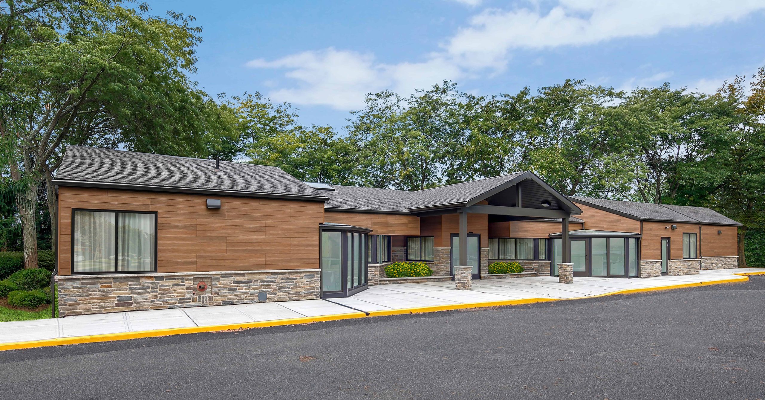 Architecture and civil engineering services for the renovation of a 6,000 medical office on 585 Cranbury Road. To achieve the residential craftsman look, the design uses modern, Nichiha siding for the upper building façade and stone for the lower portion. The existing steel columns were reused and resurfaced in stone to match the new design. New windows were installed to complement the upgraded exterior façade. Pediatric Orthopedic Associates, P.A. specializes in the management and treatment of musculoskeletal conditions that affect children from birth through adolescence, and is now part of the Robert Wood Johnson University Hospital.