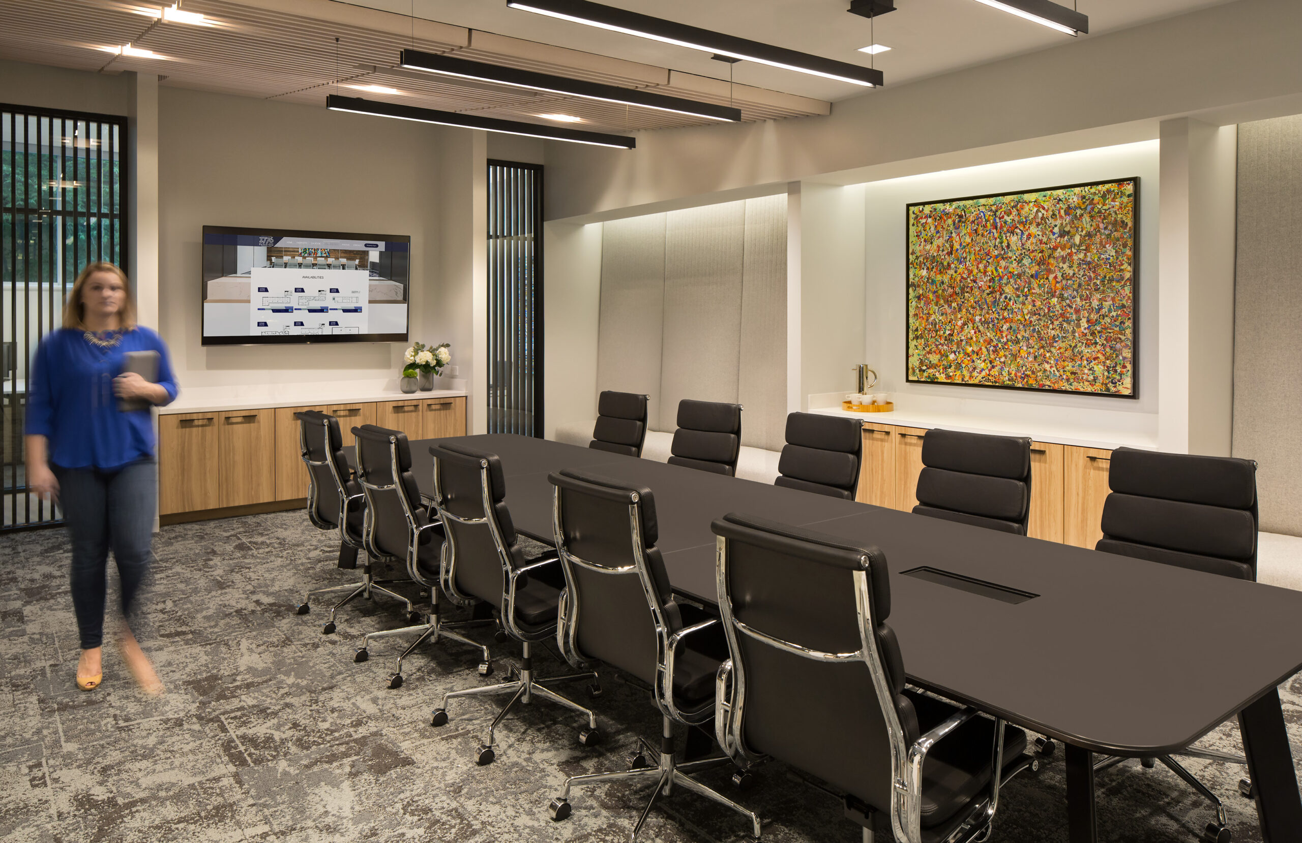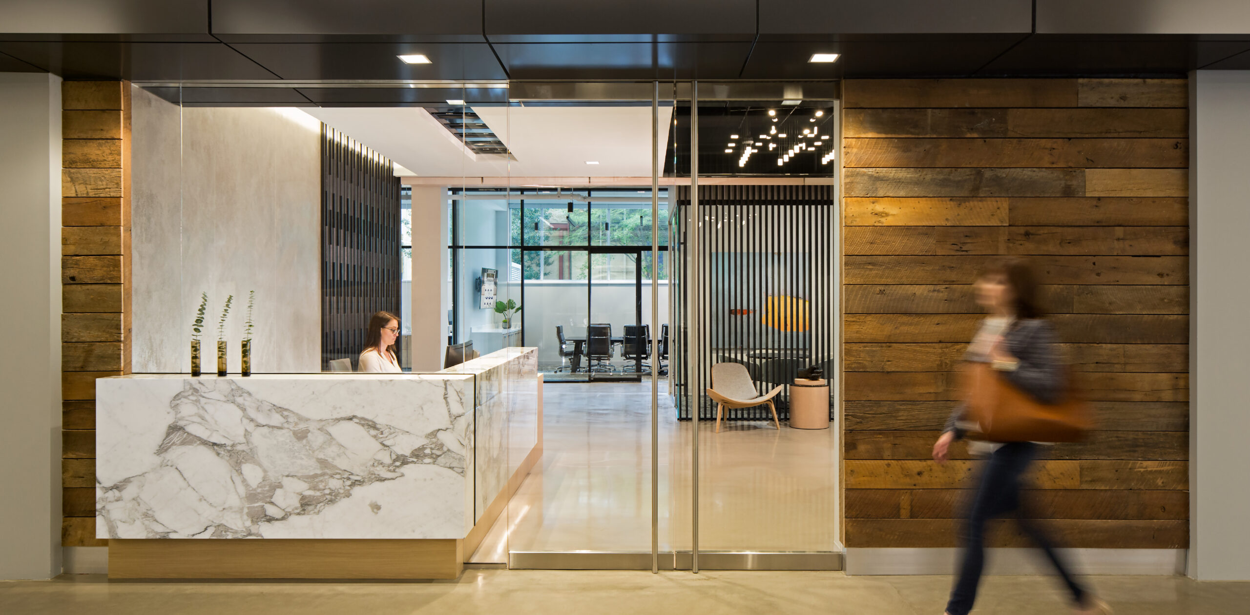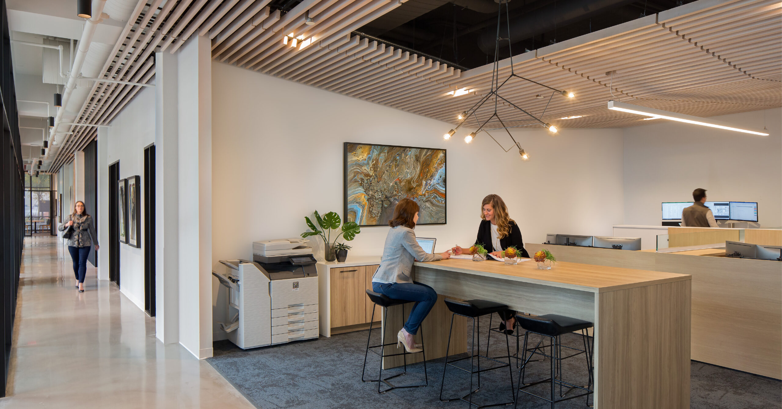 Interior design services for an 11,000 SF office that embraces openness, a connection to the outdoors, angular forms, and a clean, minimal aesthetic. Designed for a team of creators, the office supports a culture of innovation and experience-driven collaboration. A single sheet of glass defines the boundary between reception and the building lobby, offering an immediate sense of transparency and welcome. Inside, an angular ceiling element visually connects meeting rooms, collaboration zones, and social hubs, encouraging interaction and movement. Vertical slats punctuate these spaces, providing both privacy and a subtle reference to the client’s brand identity.